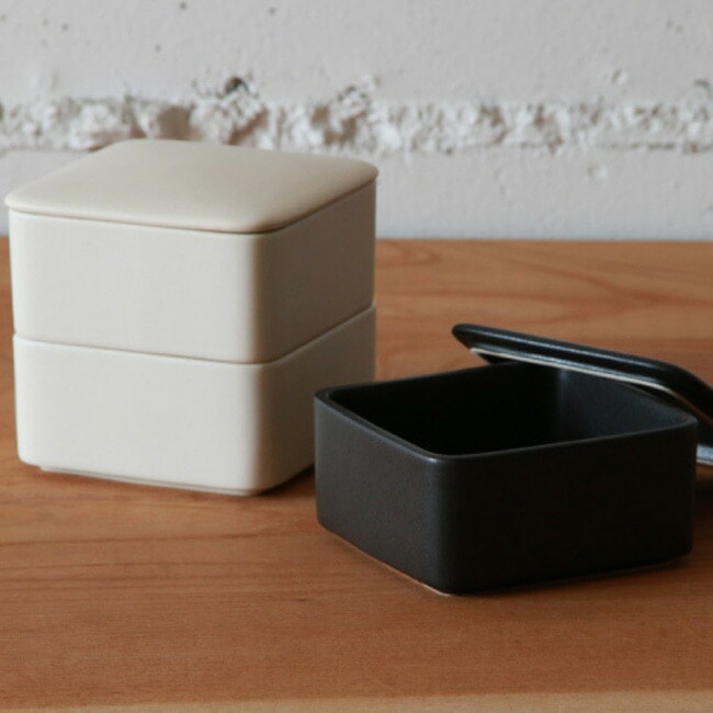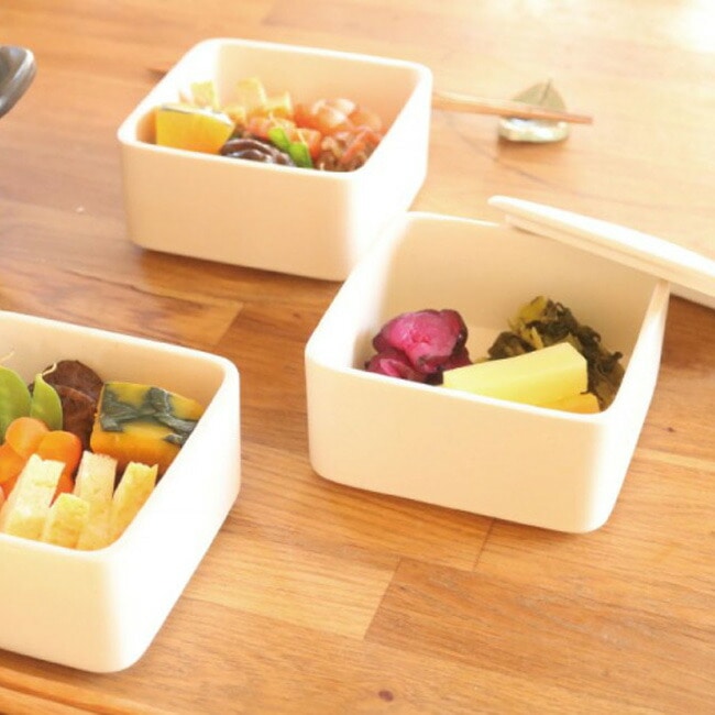 保存容器としても、器としても使えるしかくいふたもの。スタッキングができるのでお重のように積みあげることができます。