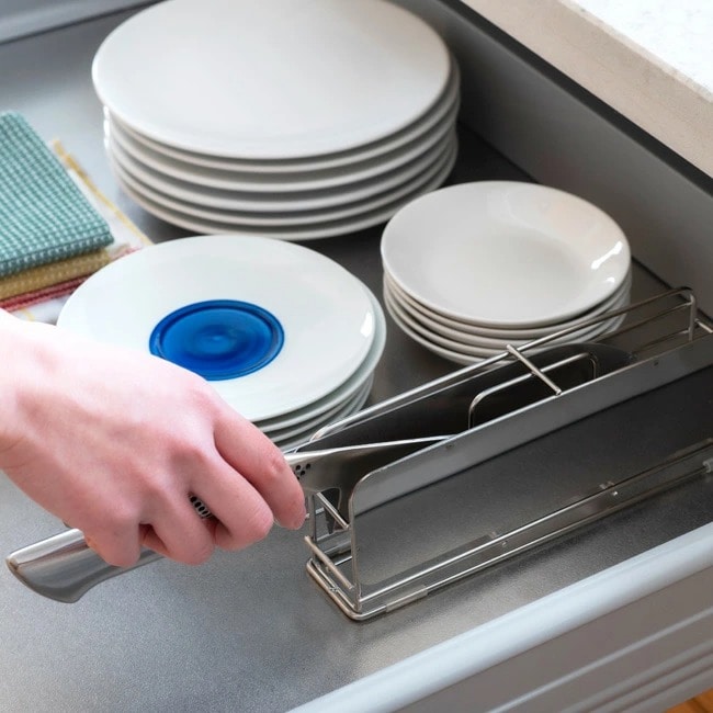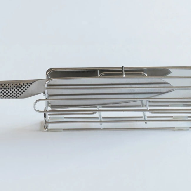 包丁は左右どちらからも出し入れ可能。横置きのため、安定感があり保管も安心。