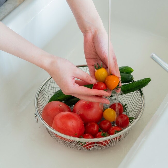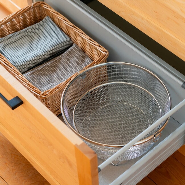 生活感を抑えたシンプルなまるい水切りかごは食器の水切り中の風景も美しくする