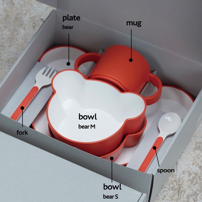 キッズディッシュプレートベア、ボウルベアS、ボウルベアM、マグ、フォーク、スプーンの6点がセットになったギフトボックスです。
