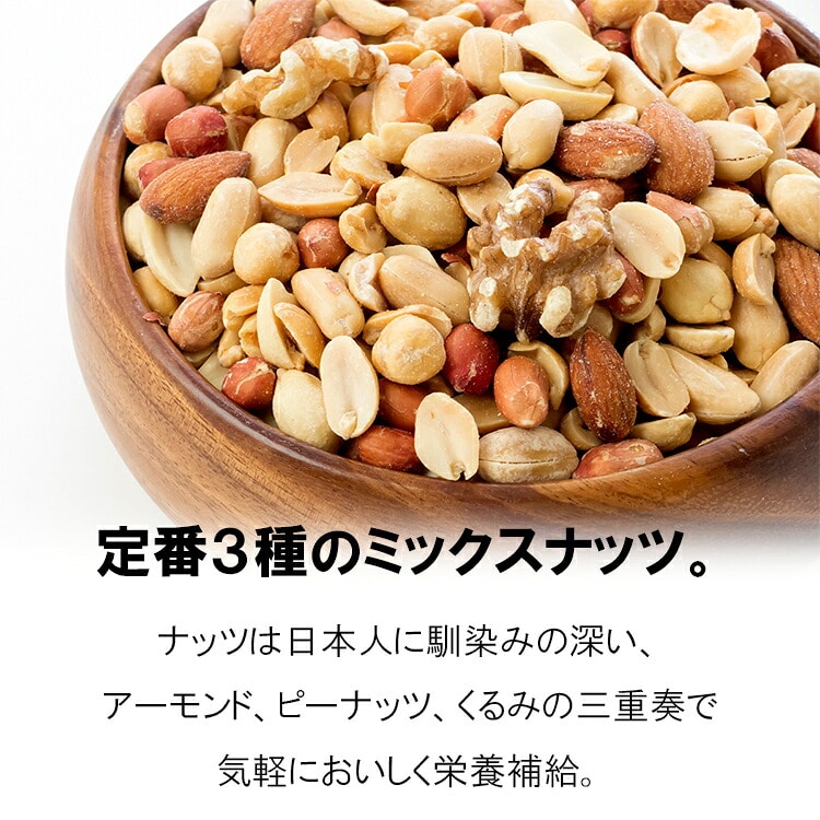 香ばしくローストしたナッツと、国産のカタクチイワシをブレンドした風味豊かなおつまみミックス。アーモンド・ピーナッツ・くるみの3種のナッツが、カタクチイワシの旨みと絶妙にマッチ。ひと口食べるたびに、香ばしさとほどよい塩味が広がります。