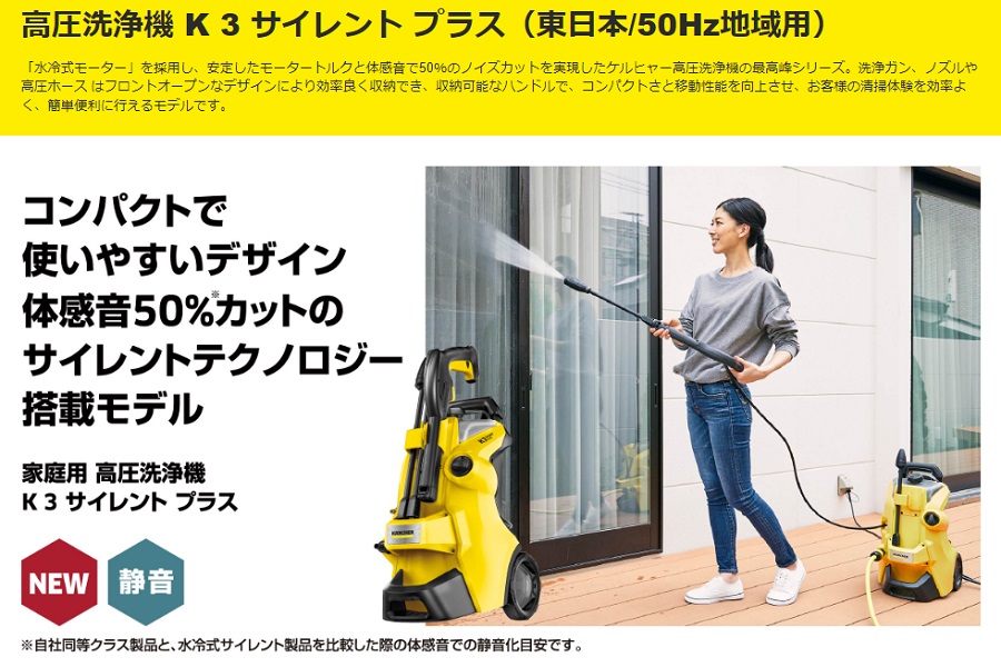 高圧洗浄機 K3 サイレント プラス KARCHER ケルヒャー 50Hz 東日本地域対応 静音 水冷式 静音 洗車 泥汚れ 掃除 汚れ ホース 小型 コンパクト タイヤ 洗浄 タイル ベランダ 1603-200