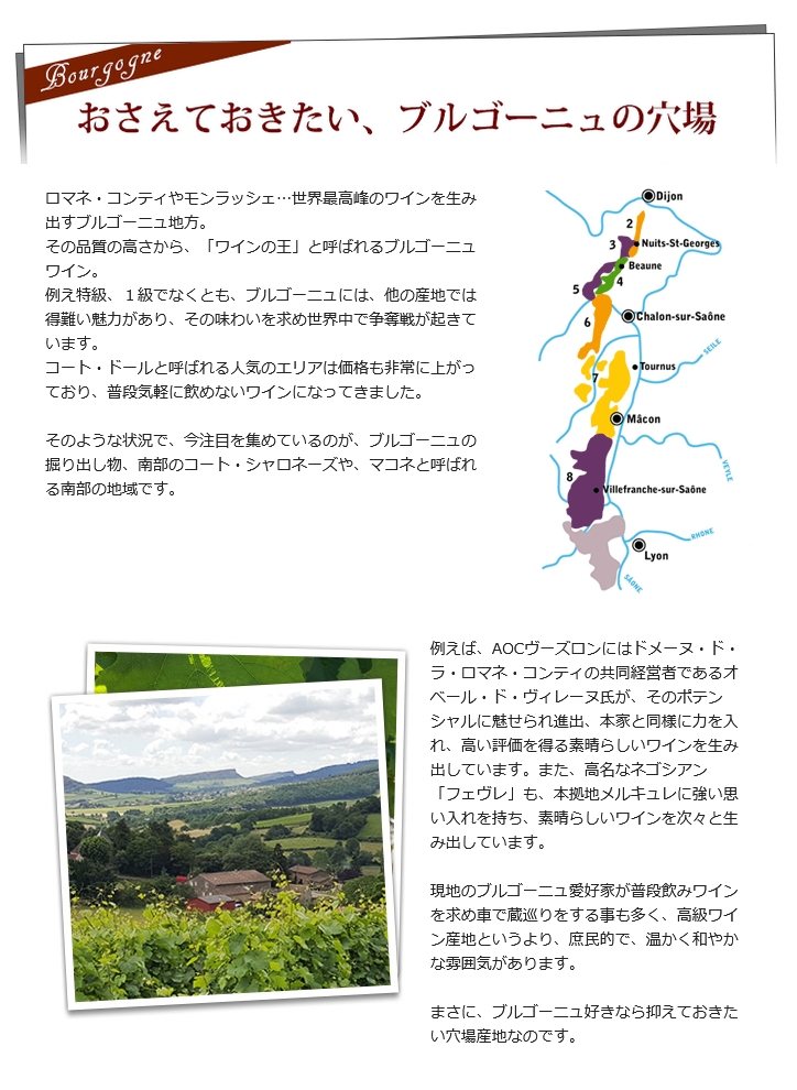 今注目を集めているのが、ブルゴーニュ地方でありながら、まだあまり知られていないこの産地、南部のコート・シャロネーズや、マコネと呼ばれる南部の地域です。