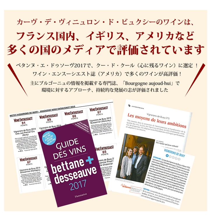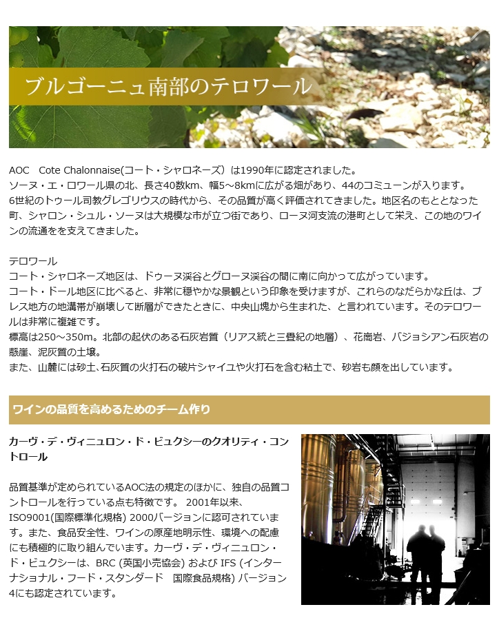 今注目を集めているのが、ブルゴーニュ地方でありながら、まだあまり知られていないこの産地、南部のコート・シャロネーズや、マコネと呼ばれる南部の地域です。 この地域をもっと発展させたいと願う、情熱溢れるブドウ栽培家たちが集まって生まれた協同組合がCave des Vignerons de Buxy(カーヴ・デ・ヴィニュロン・ド・ビュクシー)。