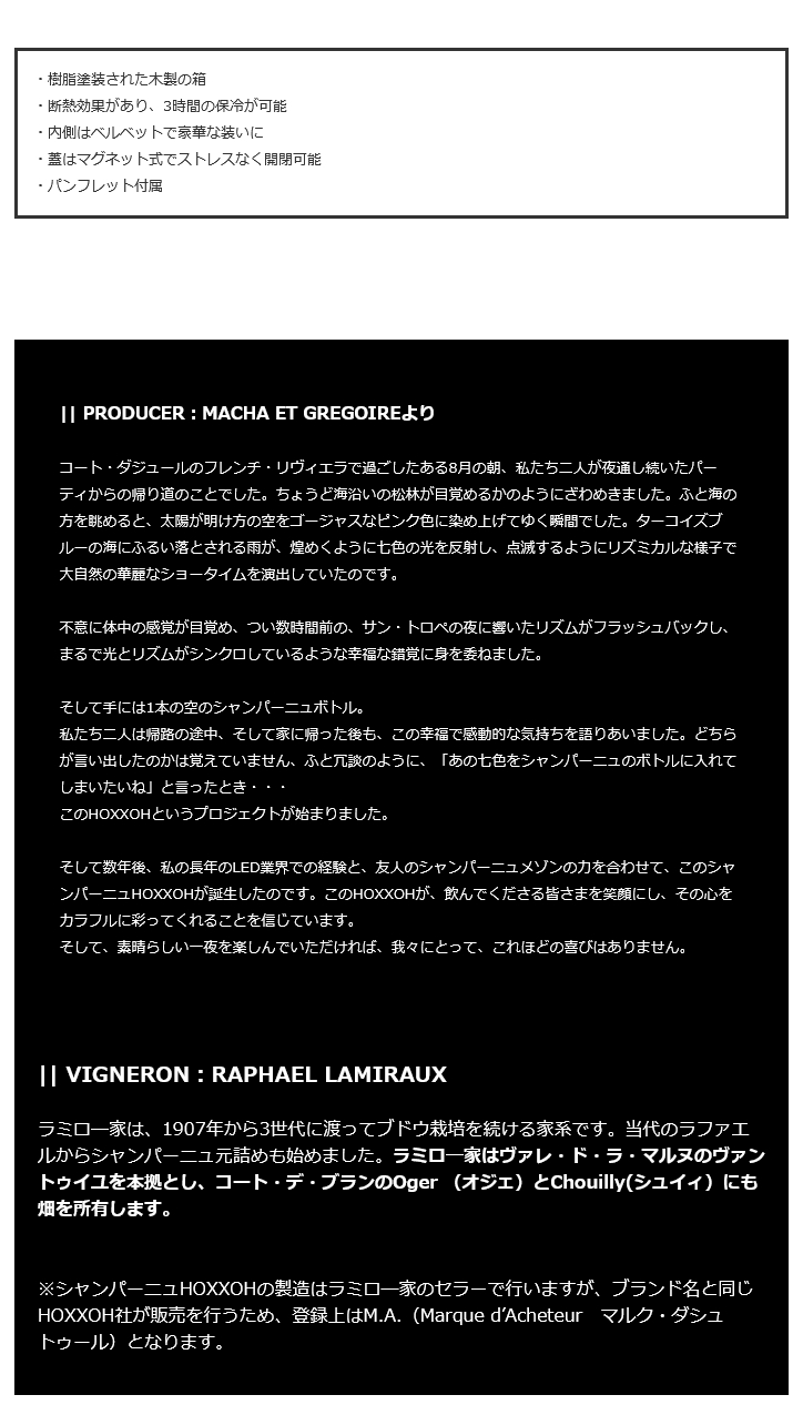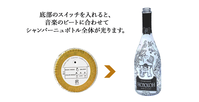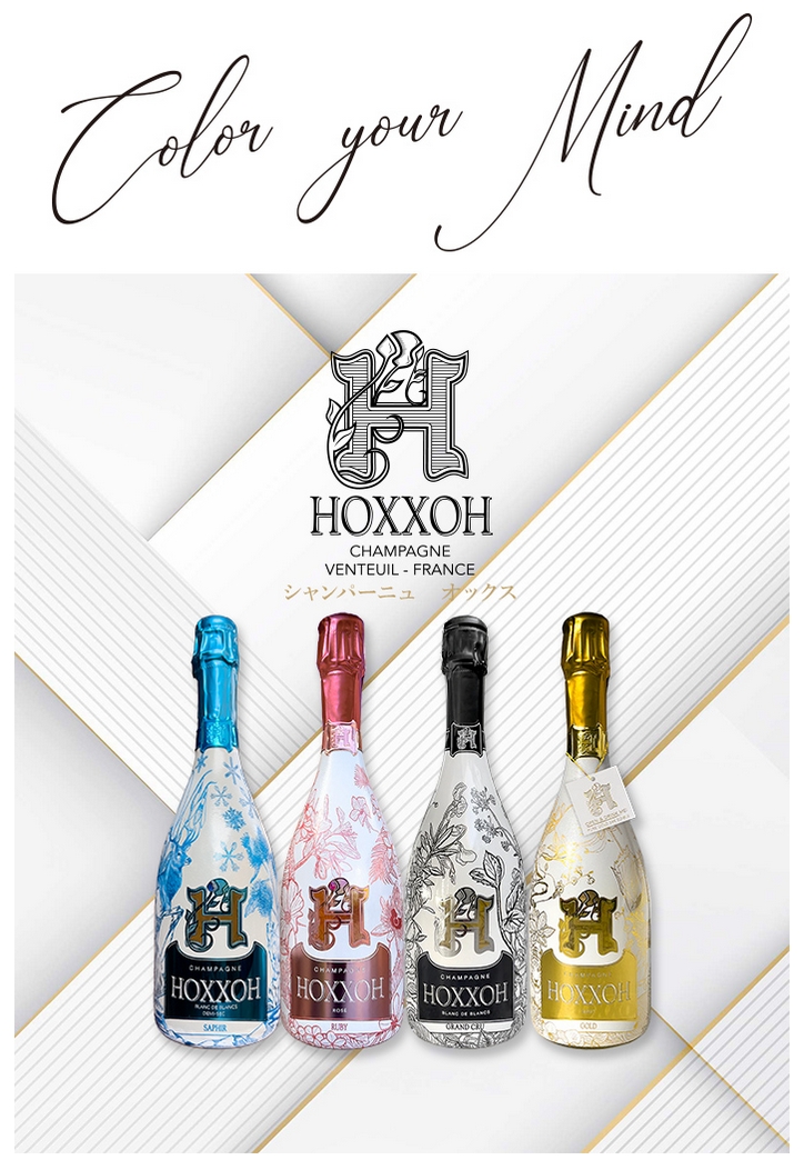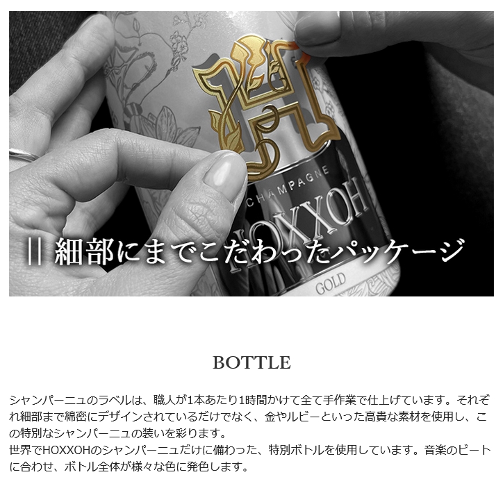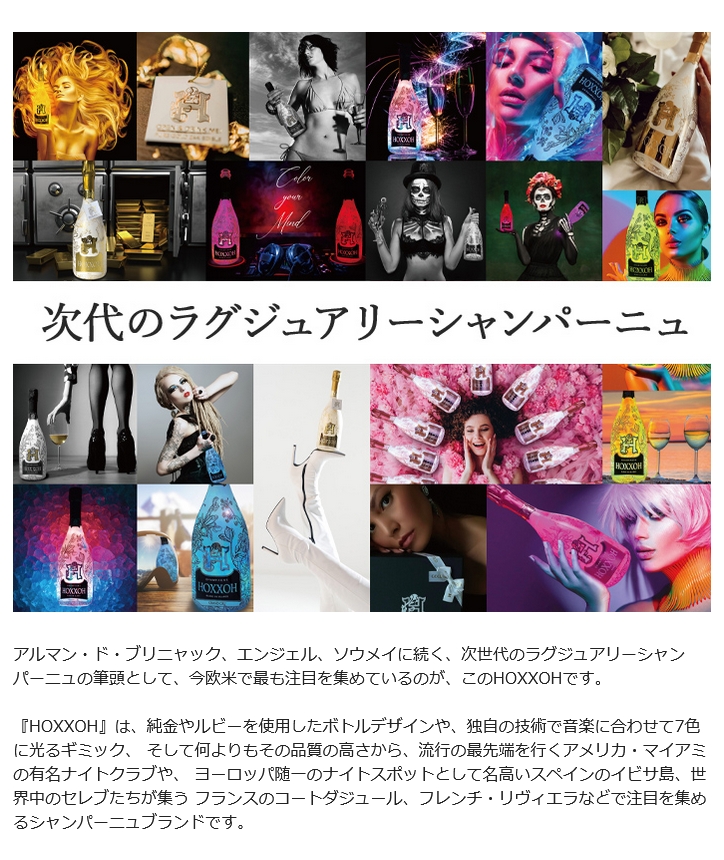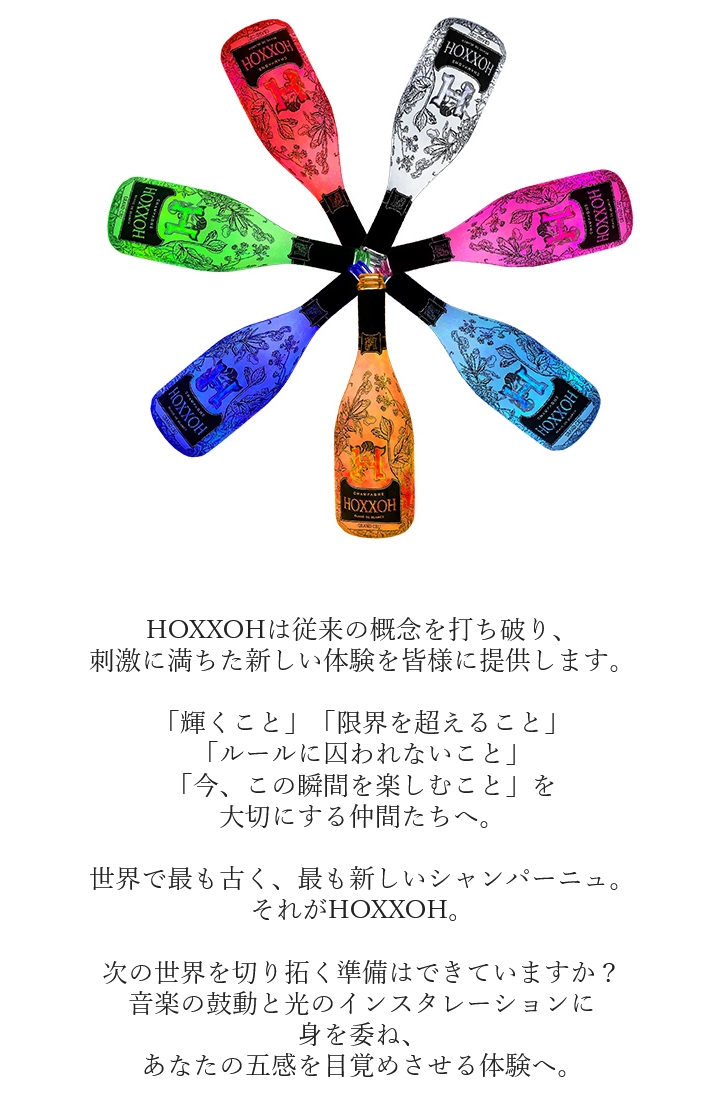 『HOXXOH』は、純金やルビーを使用したボトルデザインや、独自の技術で音楽に合わせて7色に光るギミック、 そして何よりもその品質の高さから、流行の最先端を行くアメリカ・マイアミの有名ナイトクラブや、 ヨーロッパ随一のナイトスポットとして名高いスペインのイビサ島、世界中のセレブたちが集う フランスのコートダジュール、フレンチ・リヴィエラなどで注目を集めるシャンパーニュブランドです。