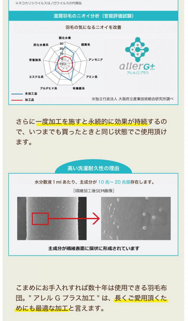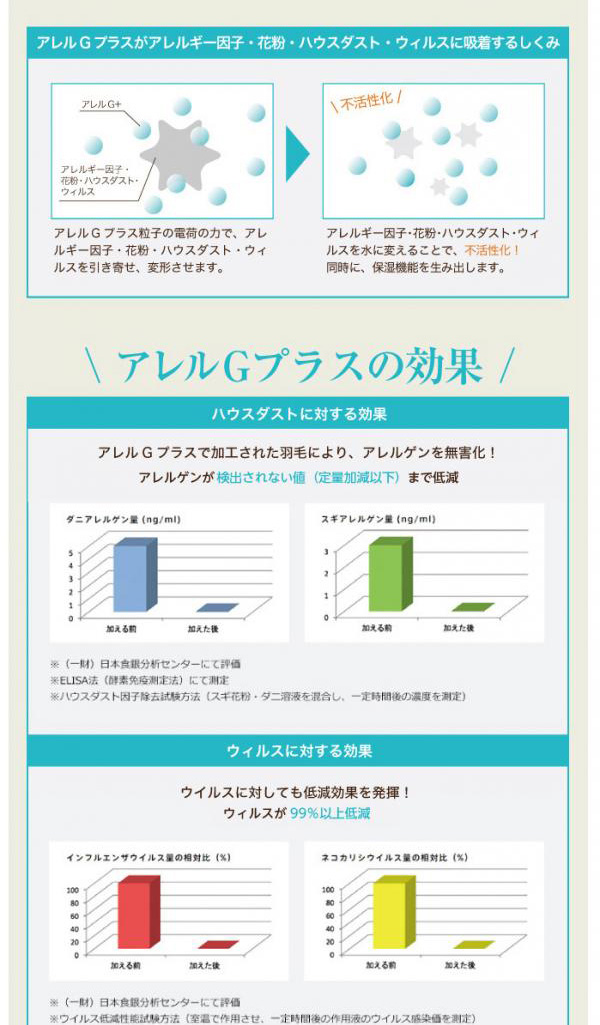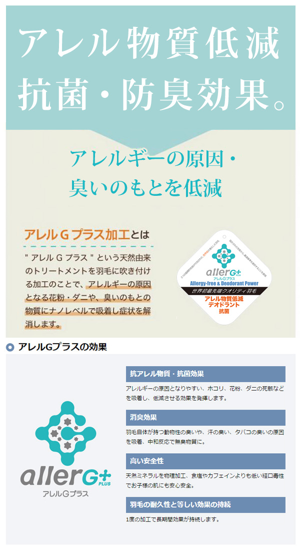 アレル物質低減とデオドラント効果、抗菌・防臭加工された羽毛を使用。
