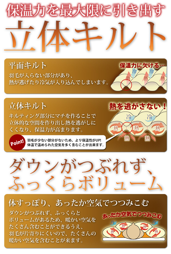 また、羽枝が細くてやわらかくコシがあるため、丈夫な上に、布団に使用 したときに肌触りが良くて体にフィットします。