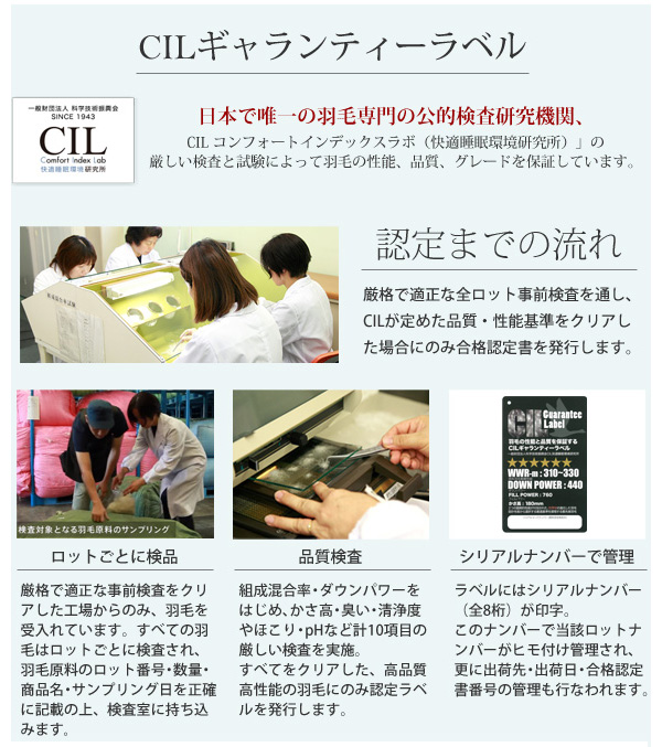 厳格で適正な全ロットの事前検査を通し、CILが定めた品質・性能基準をクリアできた場合にのみ合格認定証を発行します。組成混合率、ダウンパワー、臭い、清浄度など様々な指標を適切な方法で検査することで、充填羽毛がその性能を発揮する最適な状態を保持し、安心してご使用いただけることを保証します。
