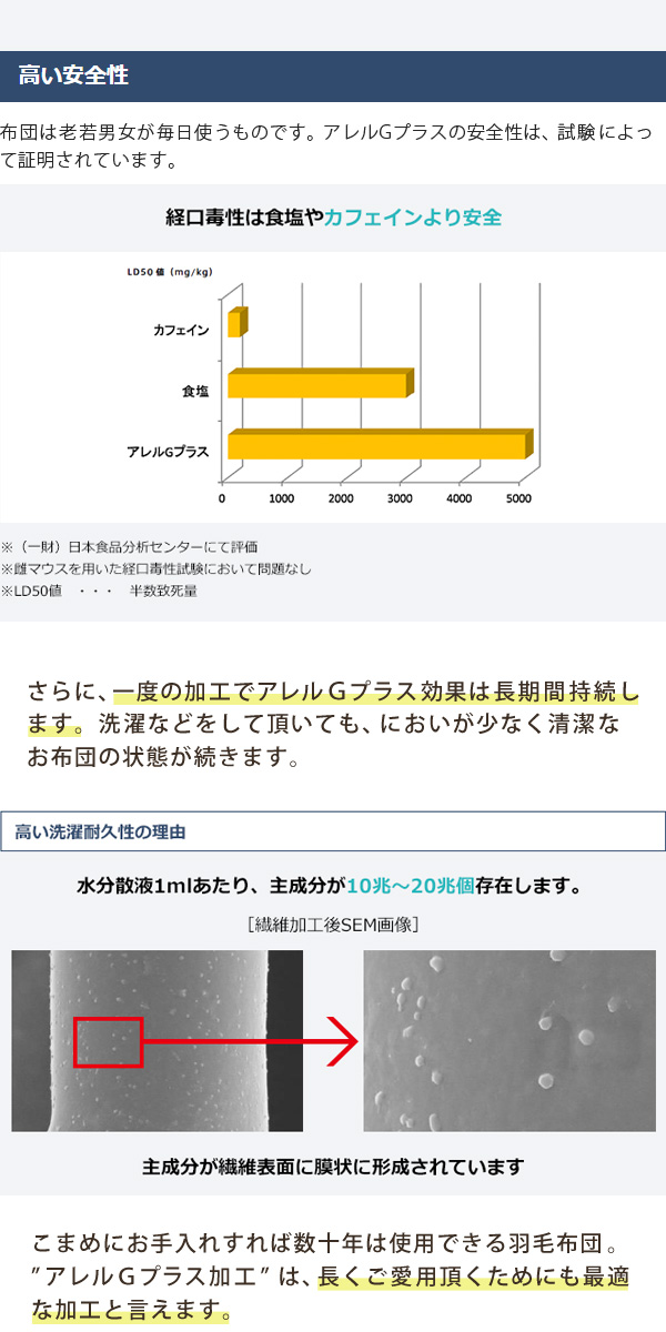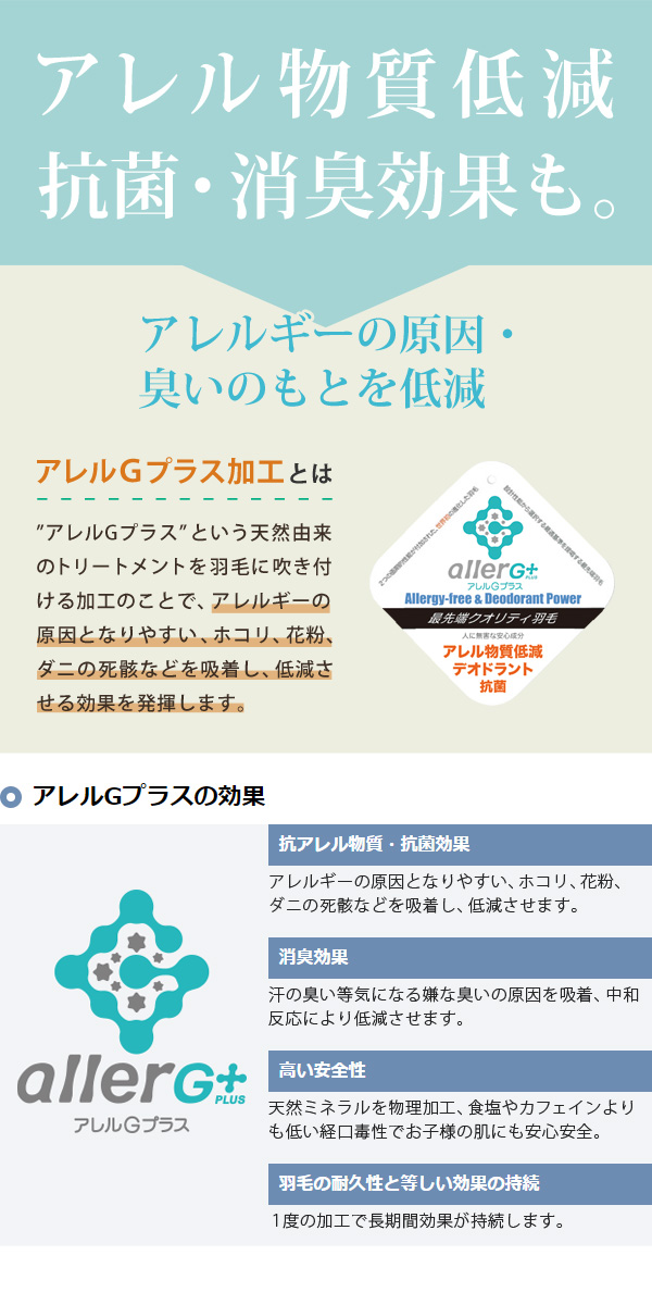 アレル物質低減とデオドラント効果、抗菌・消臭加工された羽毛を使用。