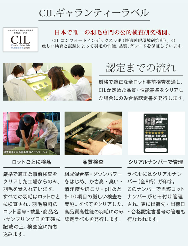 厳格で適正な全ロットの事前検査を通し、CILが定めた品質・性能基準をクリアできた場合にのみ合格認定証を発行します。組成混合率、ダウンパワー、臭い、清浄度など様々な指標を適切な方法で検査することで、充填羽毛がその性能を発揮する最適な状態を保持し、安心してご使用いただけることを保証します。