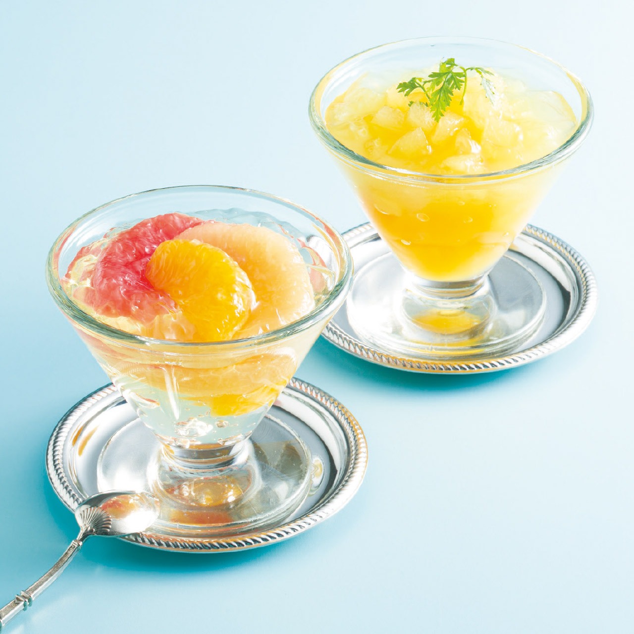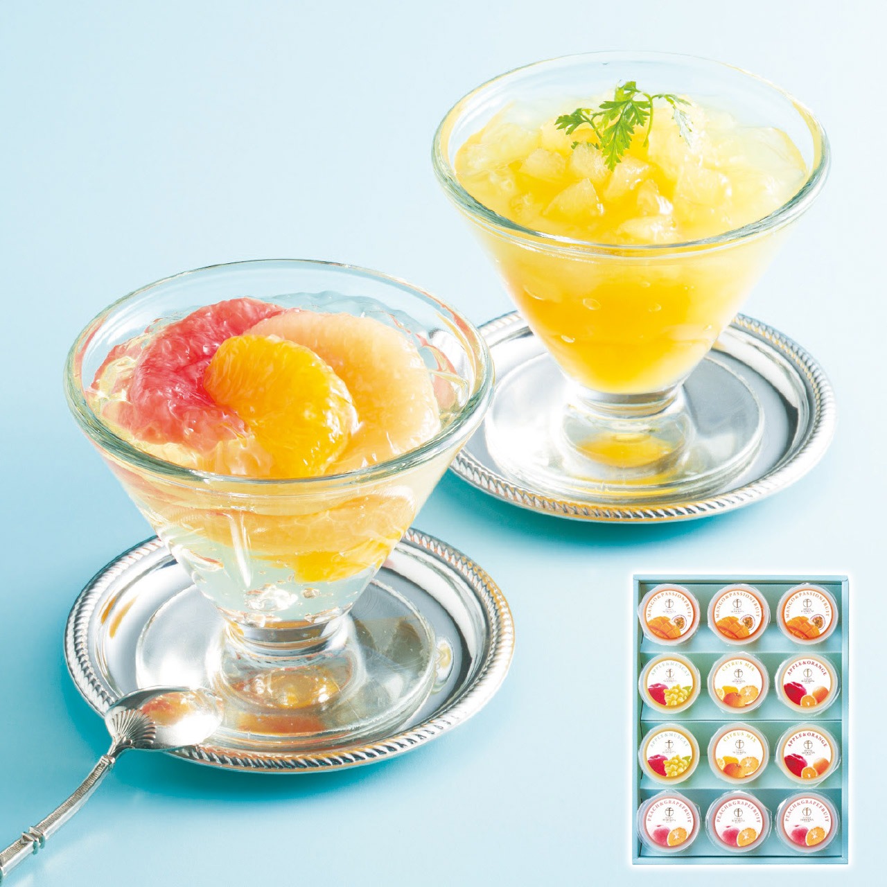 フルーツの美味しさをぎゅっと閉じ込めた、果肉入りのゼリーと、彩りも美しい2層のゼリーの詰め合わせ。