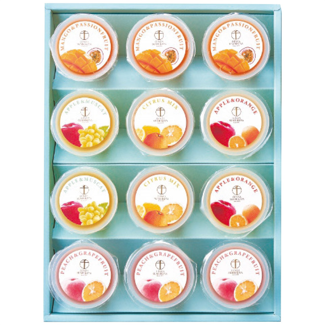 現品サイズ・内容:銀座フルーツジュレ130g(マンゴー&パッション・ピーチ&グレープフルーツ各3個・アップル&オレンジ・アップル&マスカット・シトラスミックス各2個)