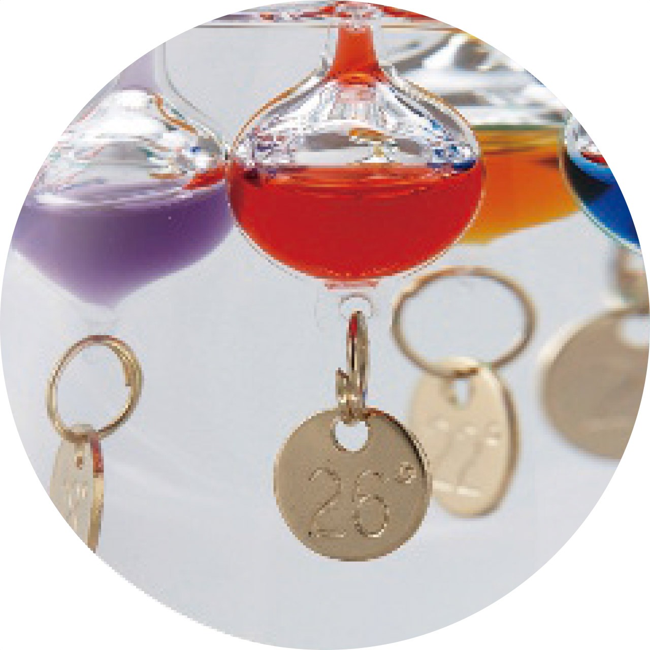 液体の比重が気温によって変化する原理を使って作られた温度計。