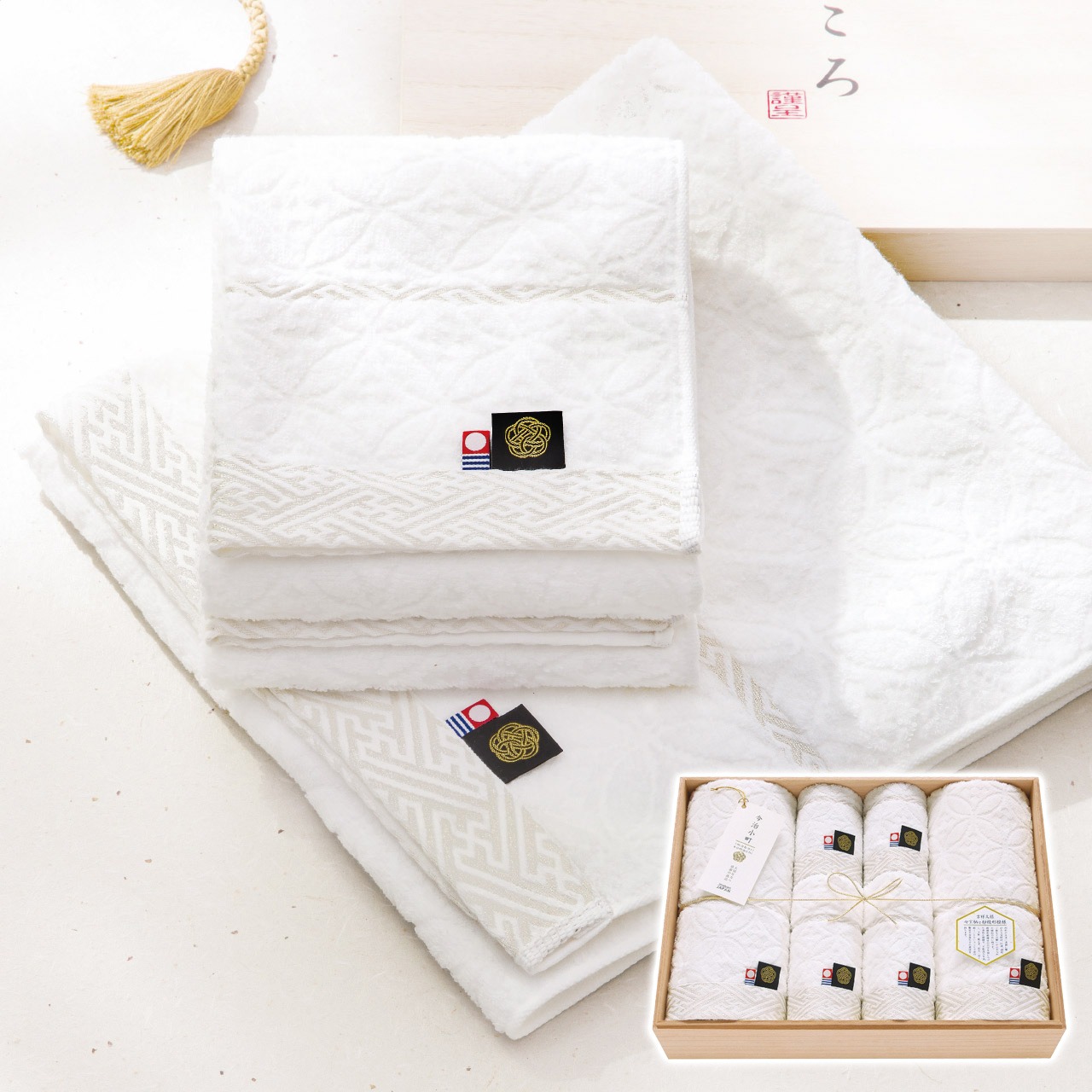 お慶びの七宝柄を毛中のジャガードで表現、光沢の糸で紗綾形模様を地づり紋織でヘムを際立たせた高級感あふれる演出のタオルギフト。
