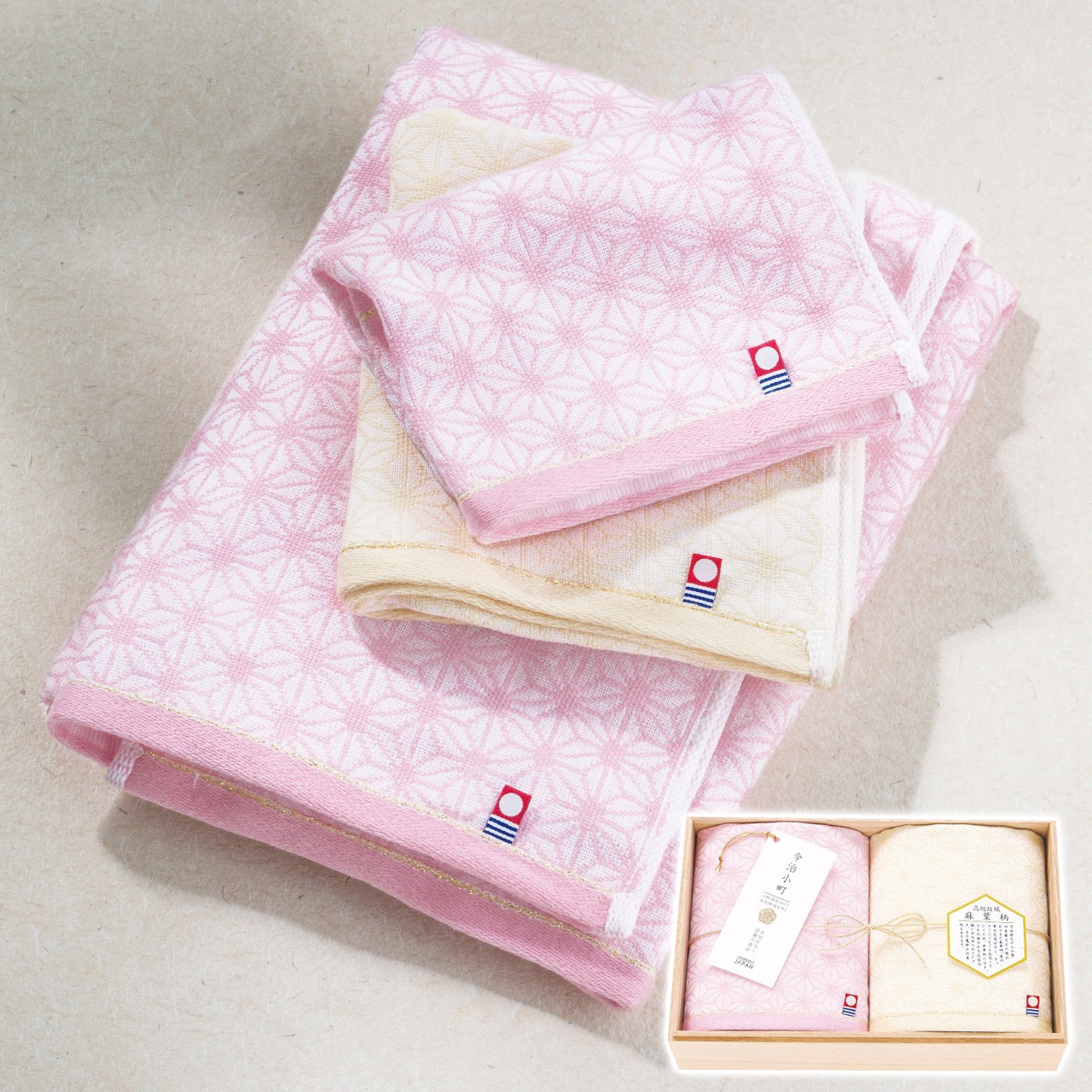 日本古来伝統の麻葉模様を今治でも数少ない先染め2紋体のガーゼ織機でやわらかに織り上げた、まごころ謹呈のギフトです。