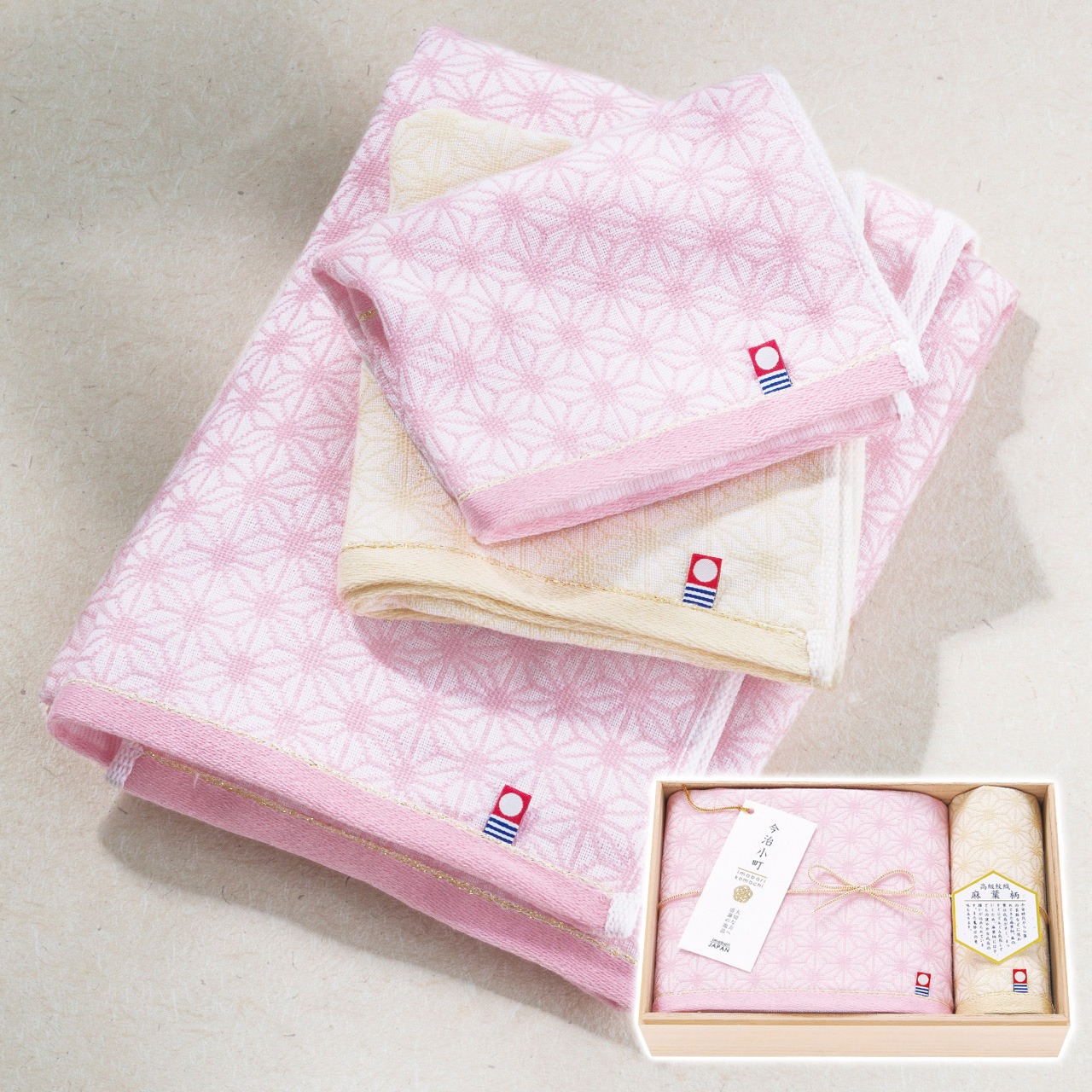 日本古来伝統の麻葉模様を今治でも数少ない先染め2紋体のガーゼ織機でやわらかに織り上げた、まごころ謹呈のギフトです。