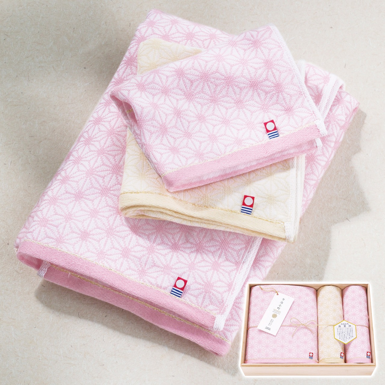 日本古来伝統の麻葉模様を今治でも数少ない先染め2紋体のガーゼ織機でやわらかに織り上げた、まごころ謹呈のギフトです。