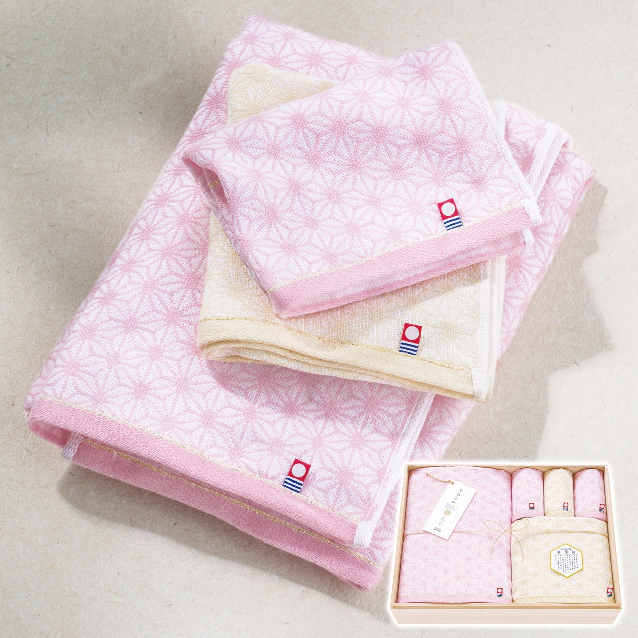 日本古来伝統の麻葉模様を今治でも数少ない先染め2紋体のガーゼ織機でやわらかに織り上げた、まごころ謹呈のギフトです。
