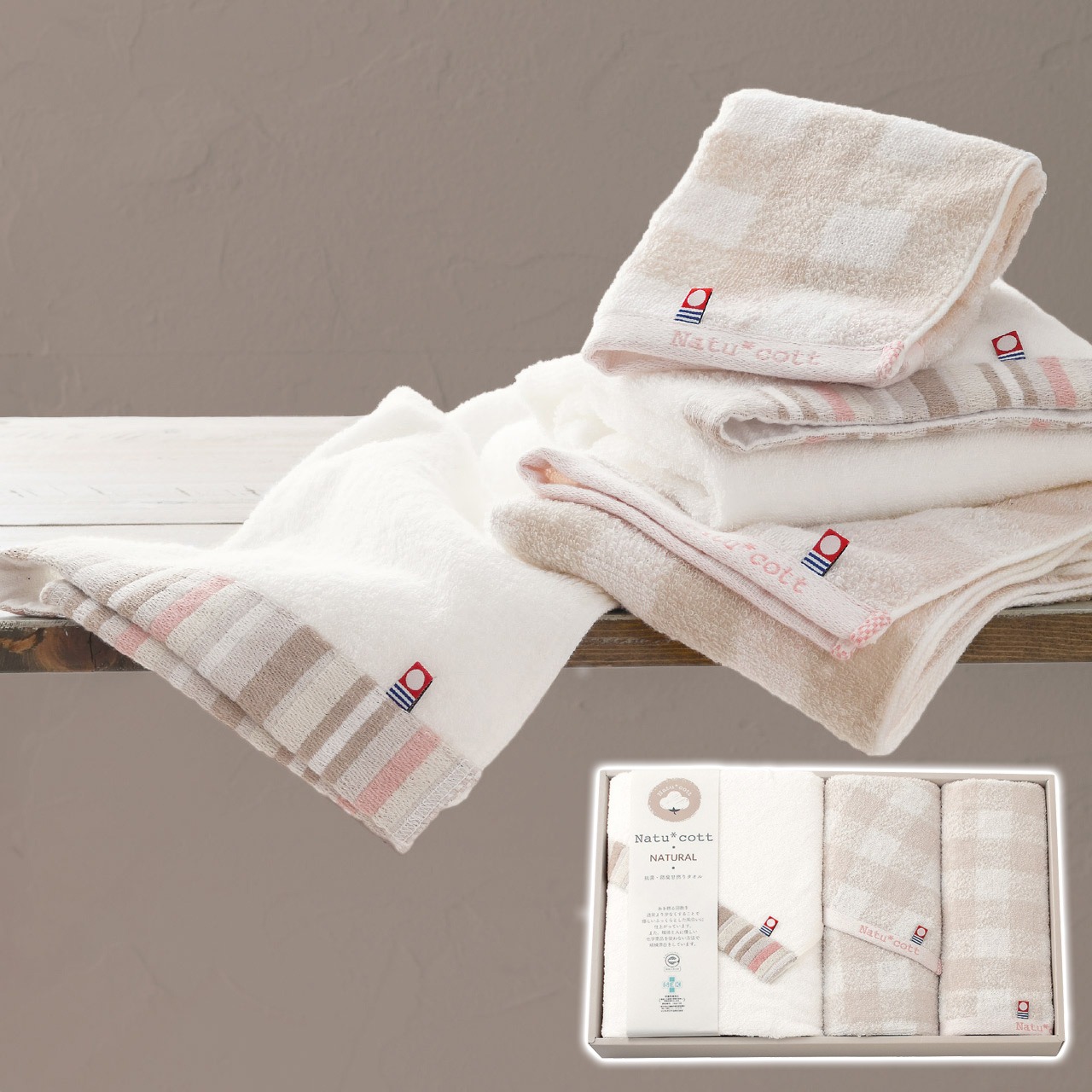 現品サイズ・内容:60×120cmバスタオル1枚・34×80cmフェイスタオル1枚・34×36cmウォッシュタオル1枚・綿100%・[日本製]