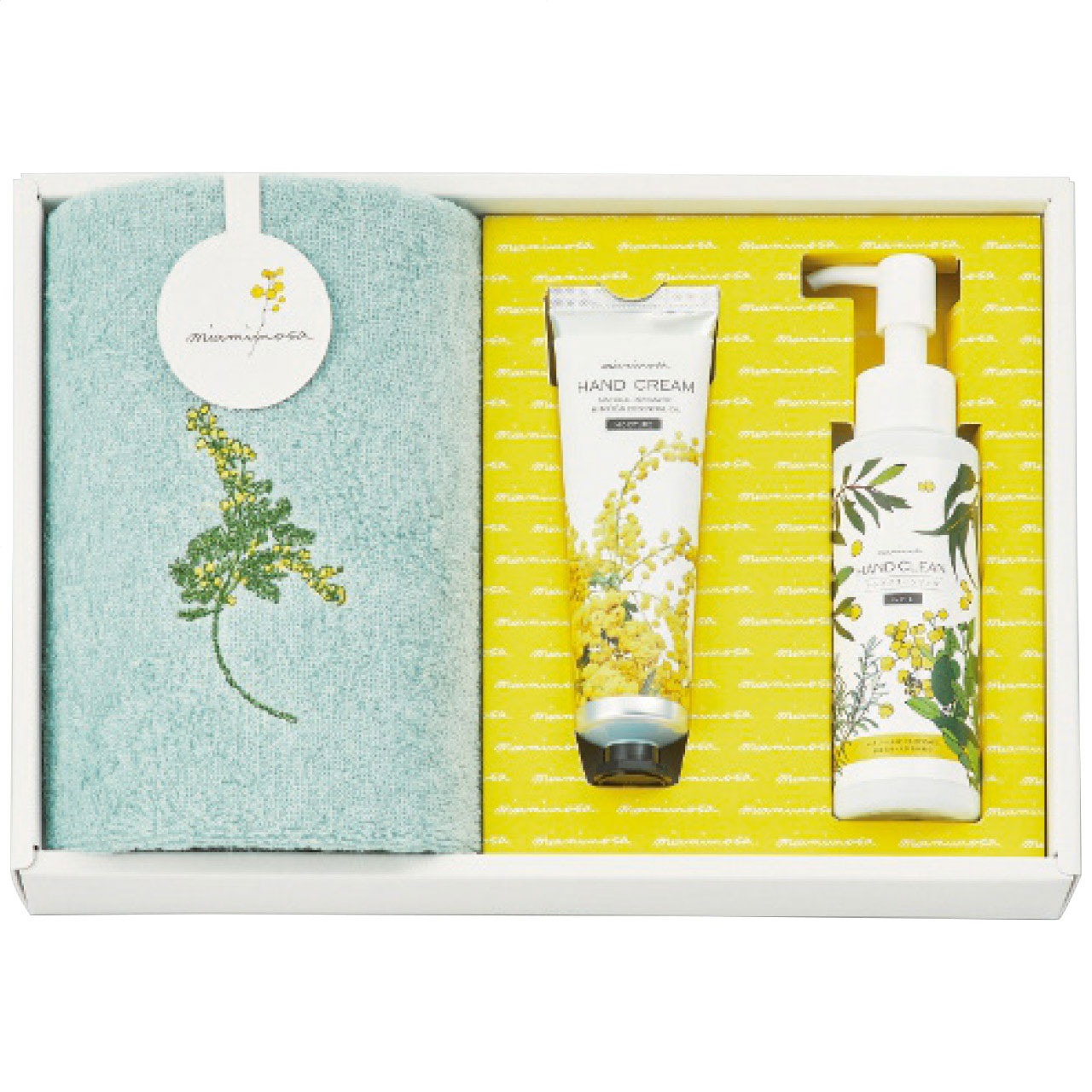 天然香料ミモザ精油がふんわりと柔らかく香る、するすると伸びる滑らかな使い心地のハンドクリームと、保湿成分ヒアルロン酸と、香料(ティーツリー・ユーカリ・ニアウリ・ラヴィンサラ・ミモザ)のアロマ精油を配合した、ほんのりとアロマの香り漂うハンドクリーンジェルと、春を告げる花ミモザをモチーフとした今治タオルのセットです。