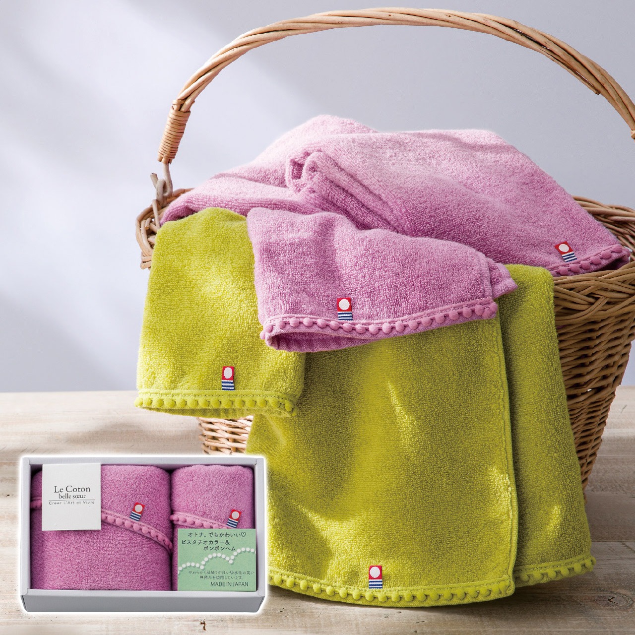 大人っぽいピスタチオカラーに可愛らしいポンポンを付けたタオルです。