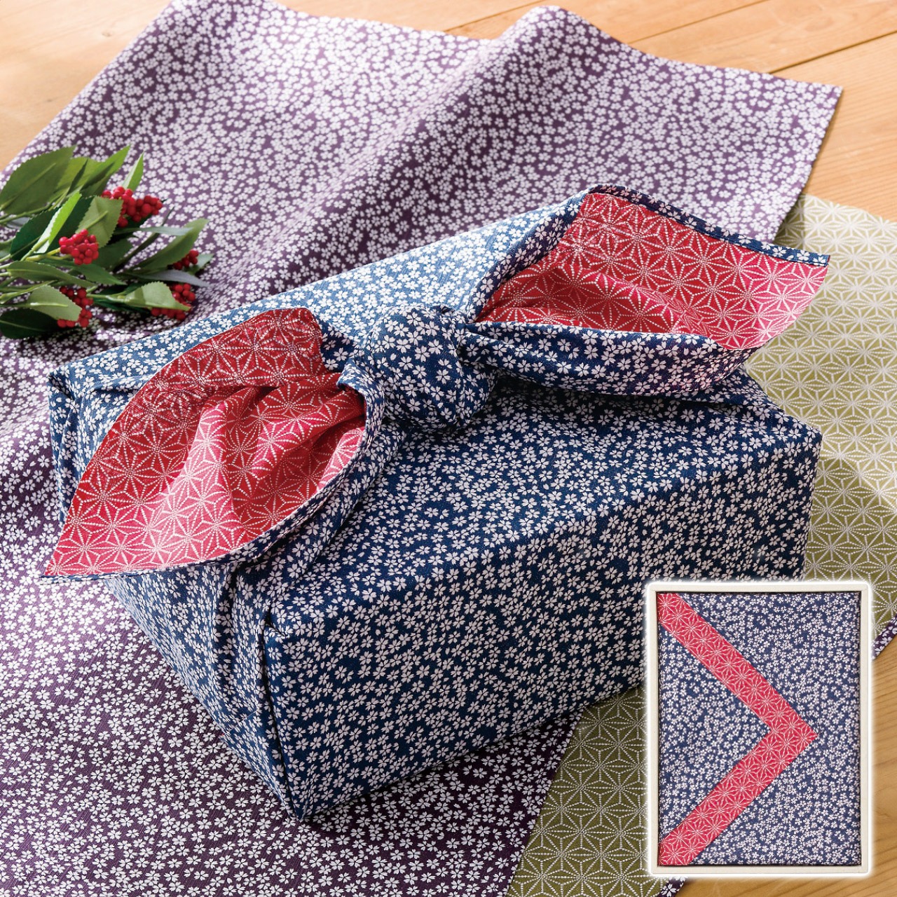 人気の小桜柄とシックな麻葉柄のリバーシブル風呂敷。
