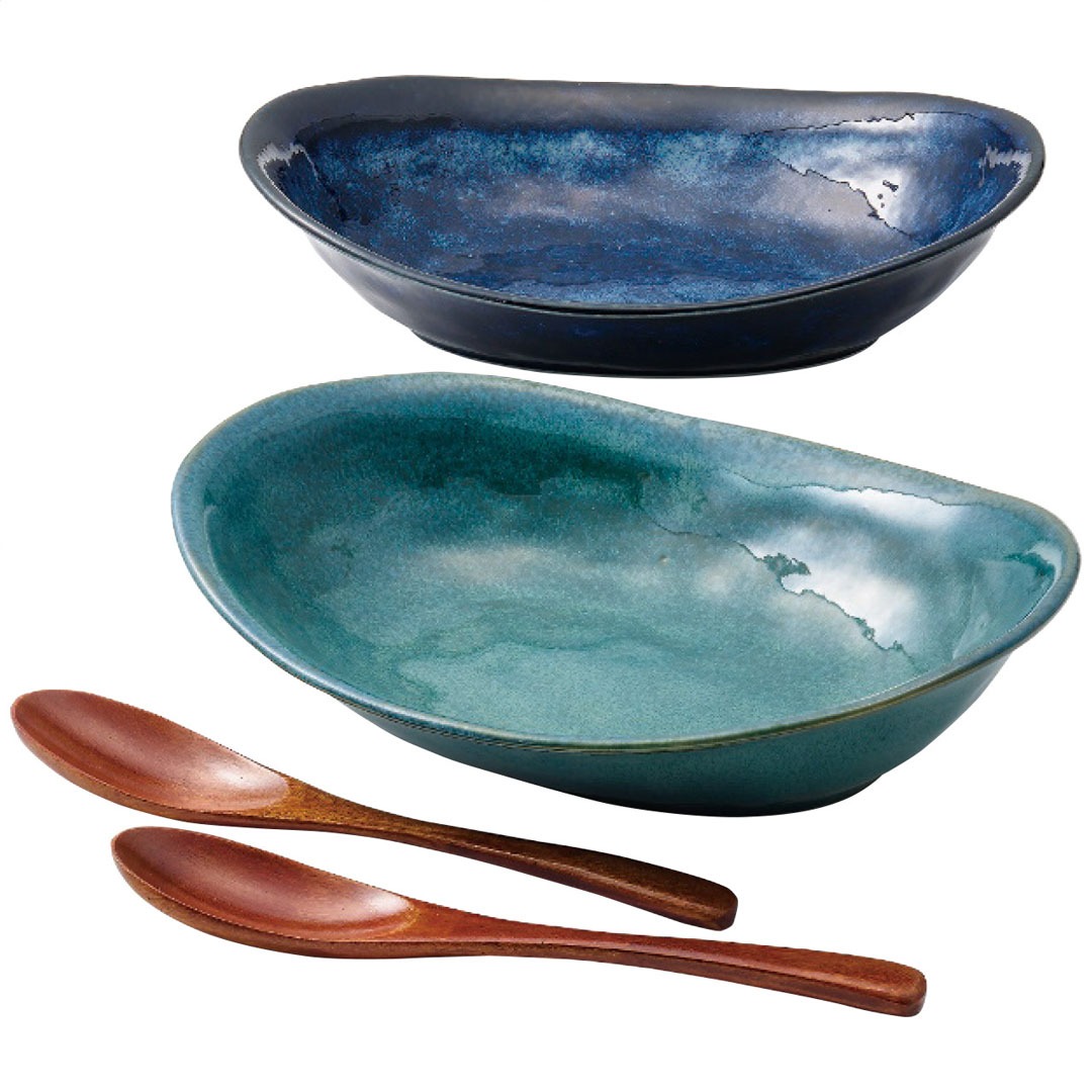 現品サイズ・内容:18.5×24×6cmカレー鉢2客・磁器・全長19.5cmスプーン2本・天然木・[日本製]・スプーン[中国製]