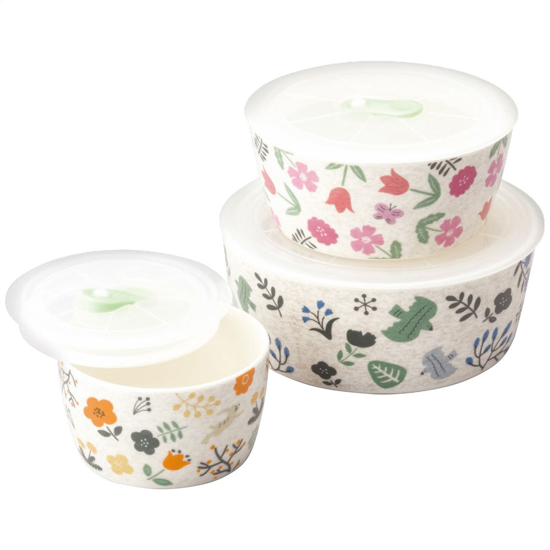 現品サイズ・内容:直径15.4cm高さ5.8cm容量約680mlレンジパック(L)・直径12.8cm高さ5.5cm容量約430mlレンジパック(M)・直径9.8cm高さ5.7cm容量約260mlレンジパック(S)各1客・磁器・フタ:ポリプロピレン・[中国製]