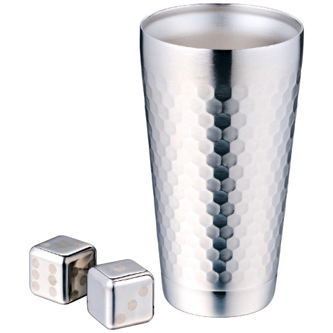 現品サイズ・内容:直径7.5cm高さ13.7cm容量約350ml2重タンブラー1客・2.5×2.5×2.5cmアイスキューブ2個・ステンレス・[中国製]