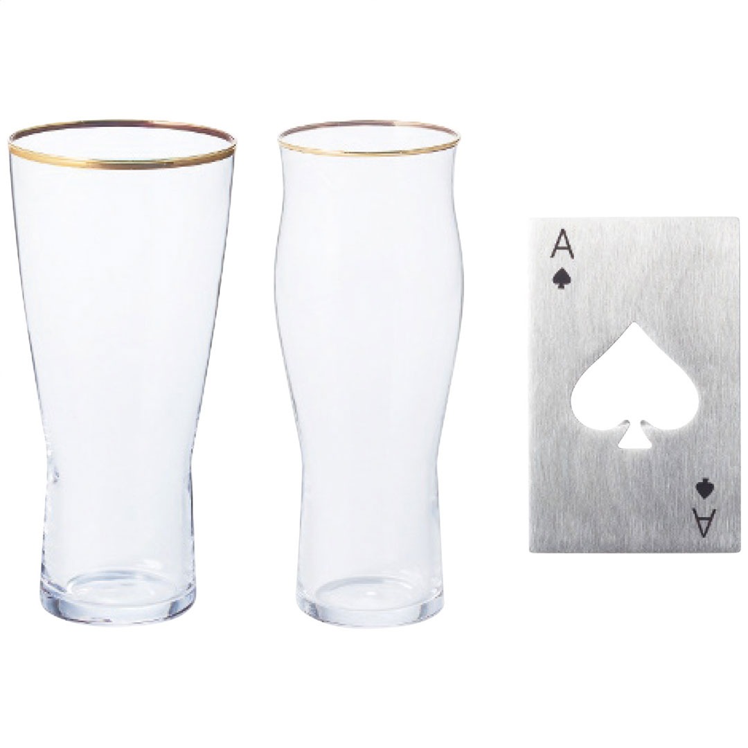 ビールの種類によって使い分けができる2種類の形状のビアグラスに遊び心いっぱいのトランプ型ボトルオープナーをセットしました。