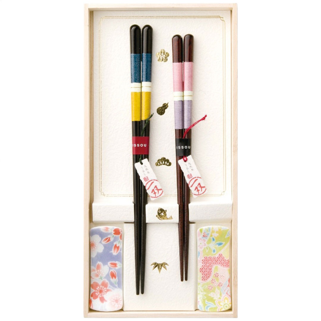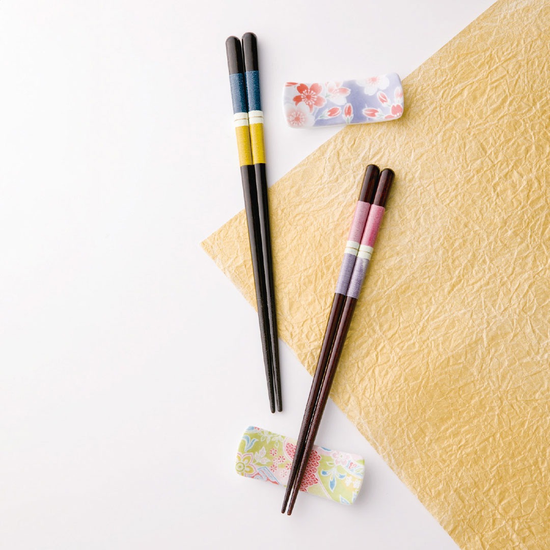 幸せな食卓を思い浮かべながら、お揃いのお箸と雰囲気を合わせた箸置とのセットを一双オリジナルの桐箱に入れました。