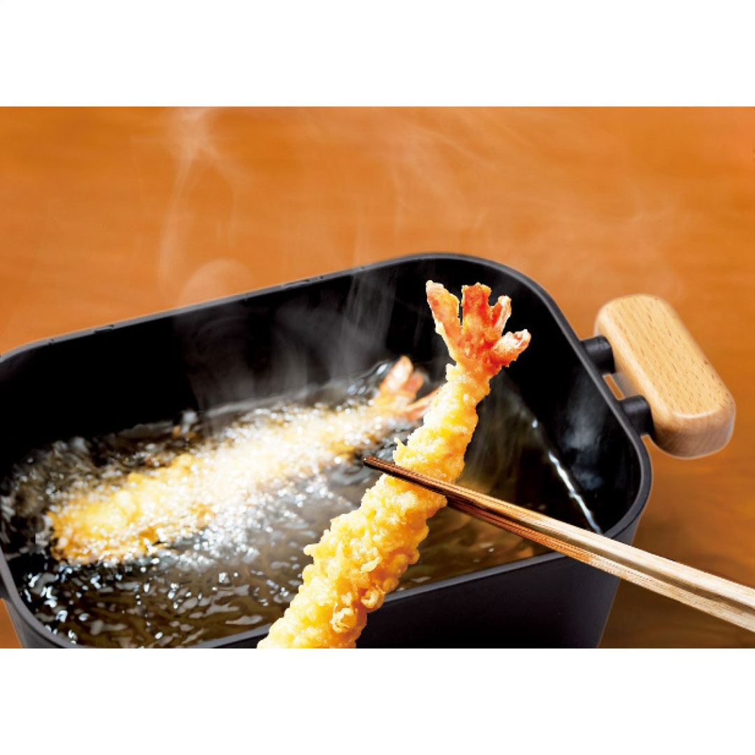 現品サイズ・内容:25×14.5×8cm天ぷらポット1個・鉄鋳物、天然木・[中国製]