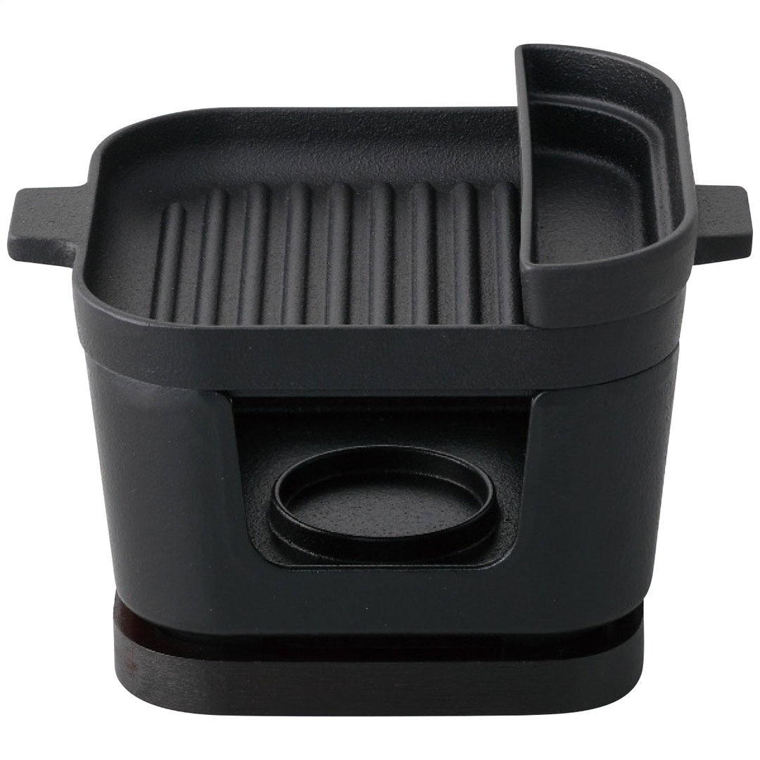 現品サイズ・内容:16.5×13.3×1.8cmグリルパン・3.9×13.8×3cm容量約90mlソースカップ各1個・鉄鋳物・13×13×7cmコンロ1個・鉄鋳物、竹・[中国製]