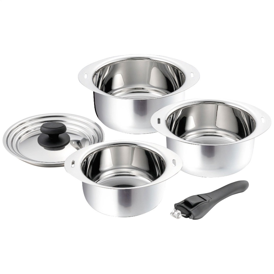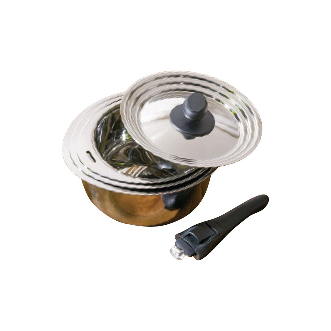 現品サイズ・内容:直径20cm、直径18cm、直径16cmソースポット各1個・ステンレス、アルミ芯3層構造・兼用蓋1個・ステンレス・ハンドル1個・フェノール樹脂・[日本製]