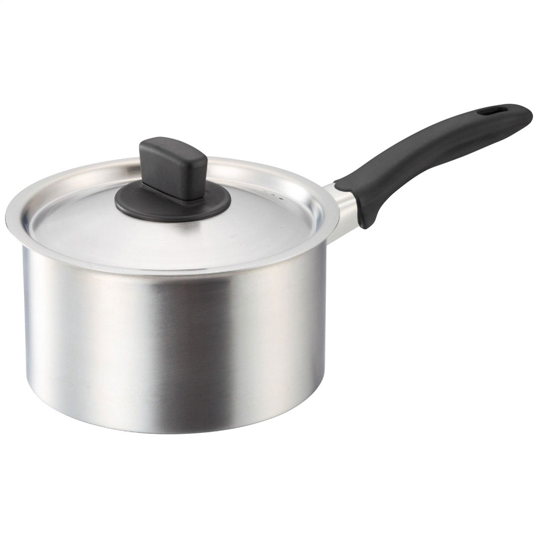 現品サイズ・内容:直径18cm片手鍋(蓋付)1個・本体:19-0ステンレス・蓋:ステンレス鋼・取っ手、ツマミ:フェノール樹脂・[日本製]