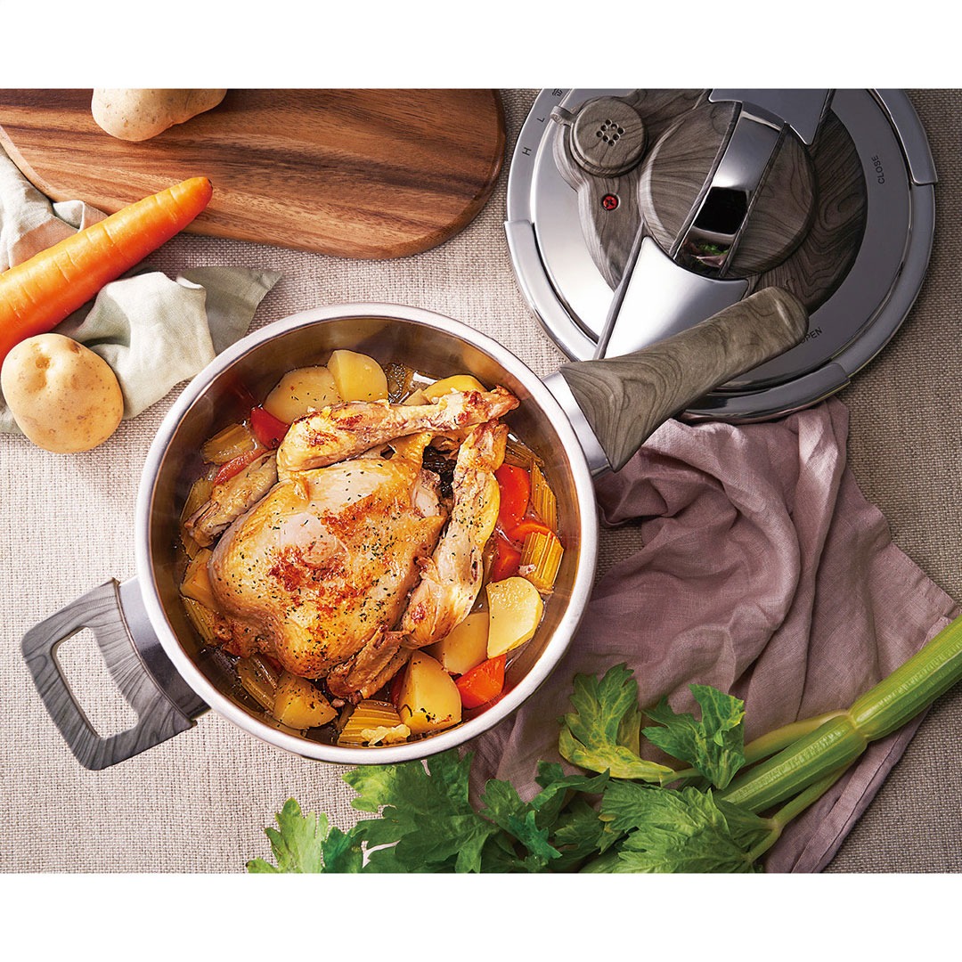 現品サイズ・内容:内径22cm圧力鍋1個・本体:ステンレス鋼・圧力蓋:ステンレス鋼、ナイロン・貼底:アルミニウム、ステンレス鋼・取っ手:フェノール樹脂・パッキン:シリコーンゴム・ガラス蓋、レシピブック付・[中国製]