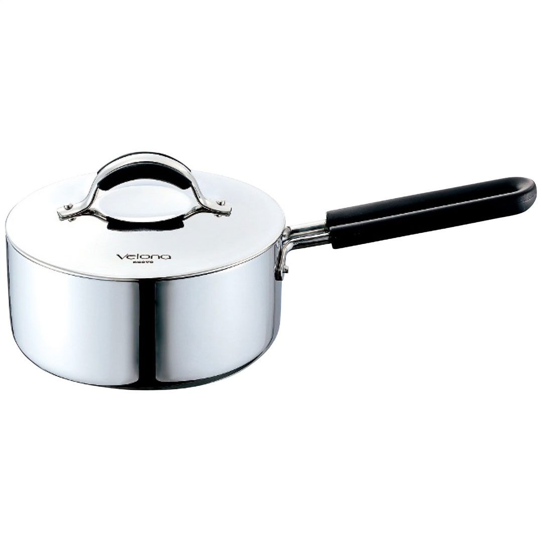 現品サイズ・内容:直径18cm片手鍋(蓋付)1個・本体:全面5層鋼(ステンレス鋼、アルミニウム合金)・蓋:ステンレス鋼・取っ手、ツマミ:ステンレス鋼、フェノール樹脂・[中国製]
