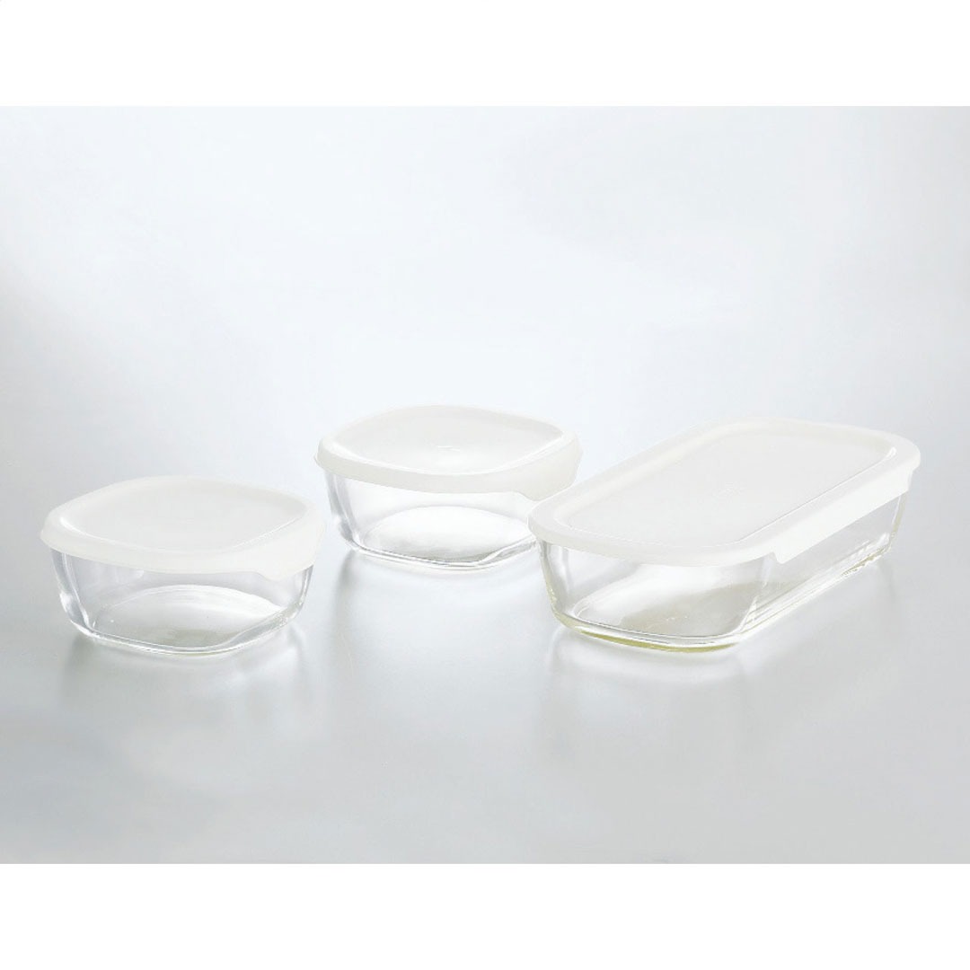 現品サイズ・内容:23.8×12.5×5.6cm容量900ml保存容器1個・11.1×10.7×4.7cm容量250ml保存容器2個・本体:耐熱ガラス・フタ:ポリプロピレン・[日本製]