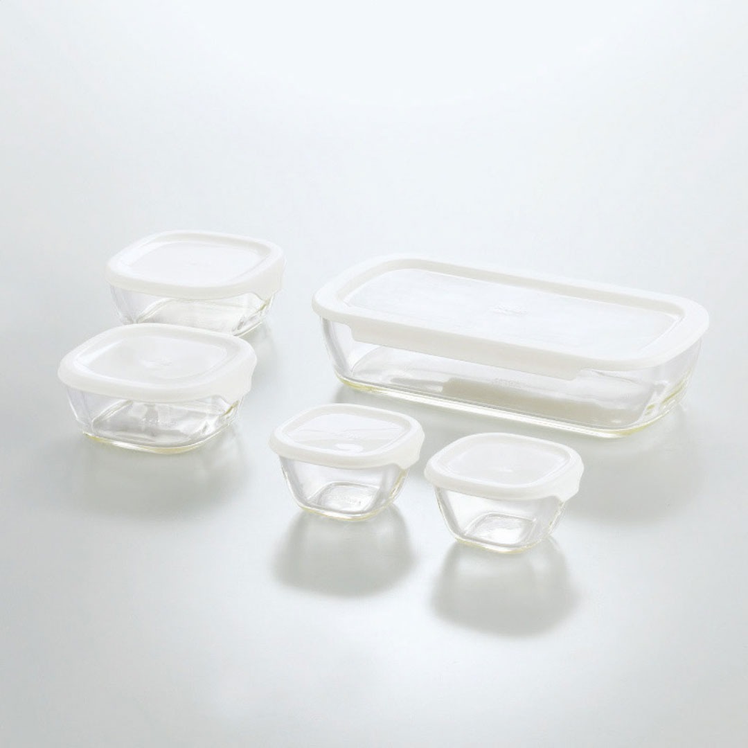 現品サイズ・内容:23.8×12.5×5.6cm容量900ml保存容器1個・11.1×10.7×4.7cm容量250ml保存容器・8.3×8.1×4.6cm容量110ml角小鉢各2個・本体:耐熱ガラス・フタ:ポリプロピレン・[日本製]