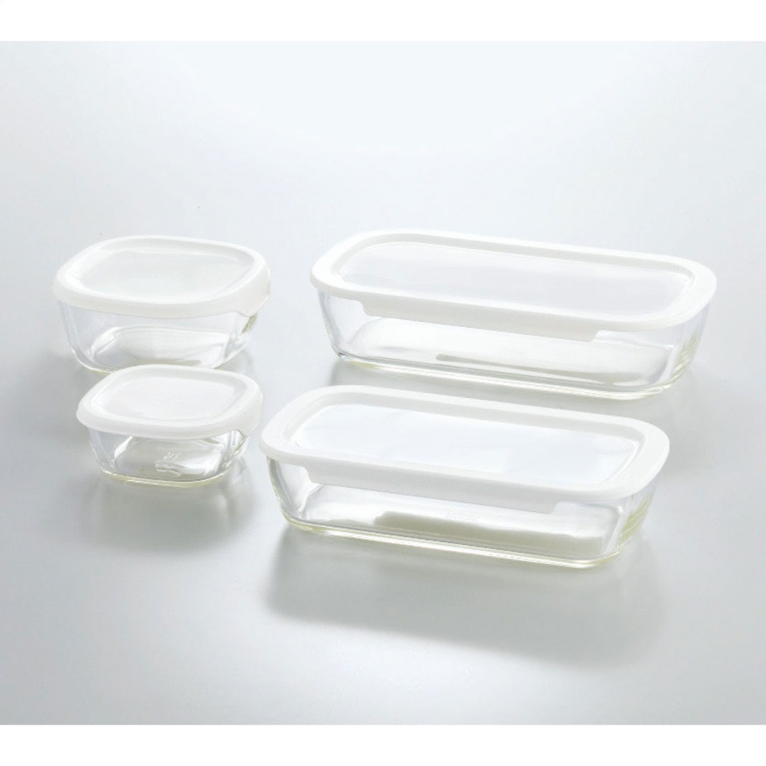 現品サイズ・内容:27×14.5×6.2cm容量1.4l保存容器・23.8×12.5×5.6cm容量900ml保存容器・14.3×13.9×6.2cm容量600ml保存容器・11.1×10.7×4.7cm容量250ml保存容器各1個・本体:耐熱ガラス・フタ:ポリプロピレン・[日本製]