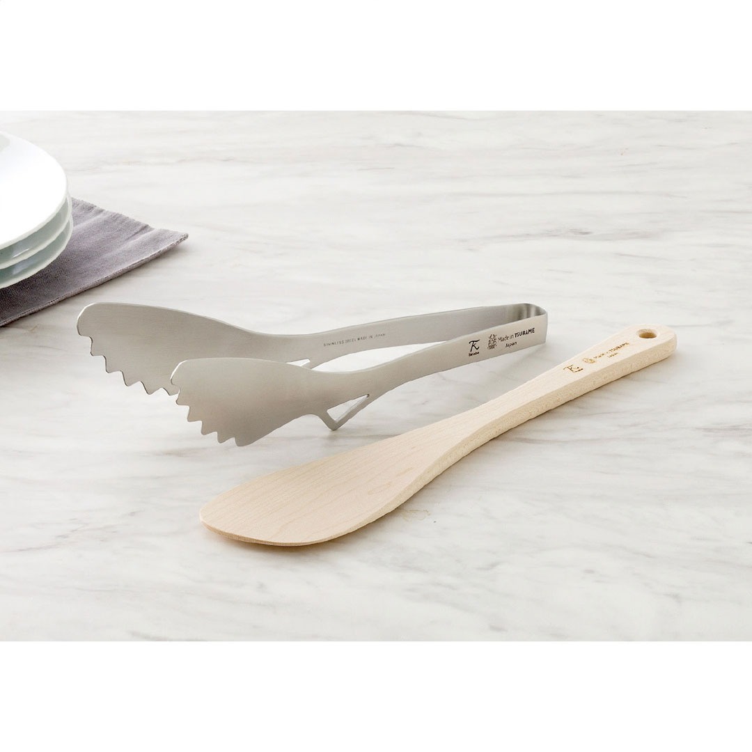 現品サイズ・内容:30×6.6cm木ベラ1本・メープル天然木・24.5×5.4cmトング1本・ステンレススチール・[日本製]