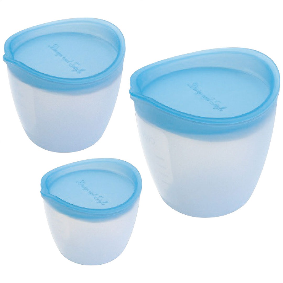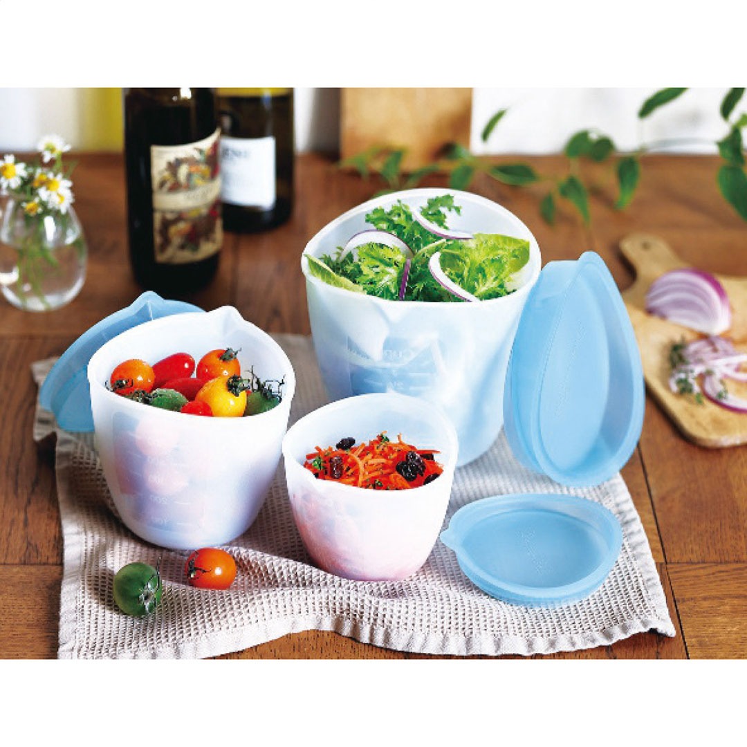 現品サイズ・内容:13.7×14.5×14cm容量700mlボウル(大)・11.4×12×10.9cm容量500mlボウル(中)・9.6×10.2×8.3cm容量250mlボウル(小)各1個・本体:シリコーンゴム・蓋:ポリプロピレン・[中国製]