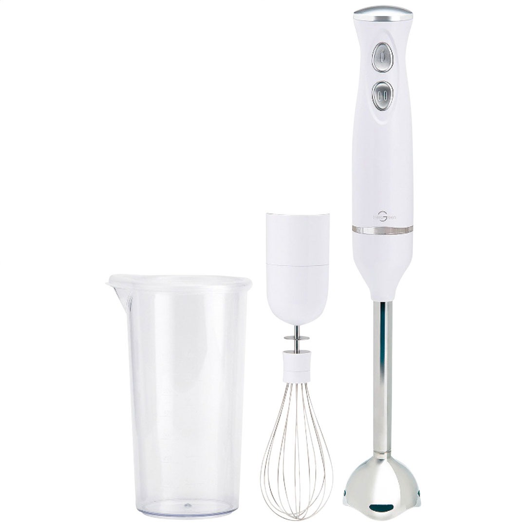 現品サイズ・内容:6.5×6.5×36cm・最大調理容量:600ml(専用計量カップ使用時)・本体:ABS樹脂・ブレンダー:ステンレス鋼・消費電力:200W・コード長:約1.5m・泡立て器、専用計量カップ付・[中国製]