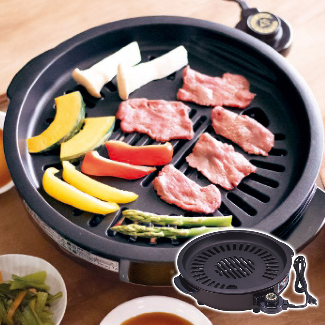 現品サイズ・内容:35.5×37×10.5cm・本体:鉄(粉体塗装)・プレート:アルミニウム合金(フッ素樹脂塗膜加工)・水受け皿:ステンレス・ハンドル、脚:フェノール樹脂・消費電力1200W・コード長約1.4m・[日本製]