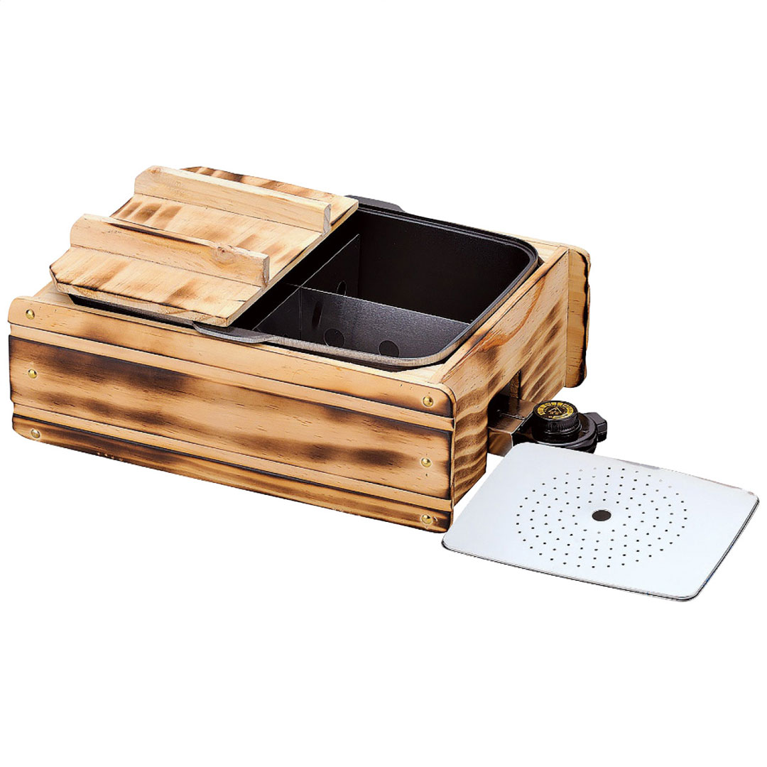 現品サイズ・内容:38.7×29×13.8cm・本体:桐材・鍋:アルミニウム合金(フッ素樹脂加工)・消費電力:1200W・コード長:約1.4m・目皿・仕切り板付・[日本製]