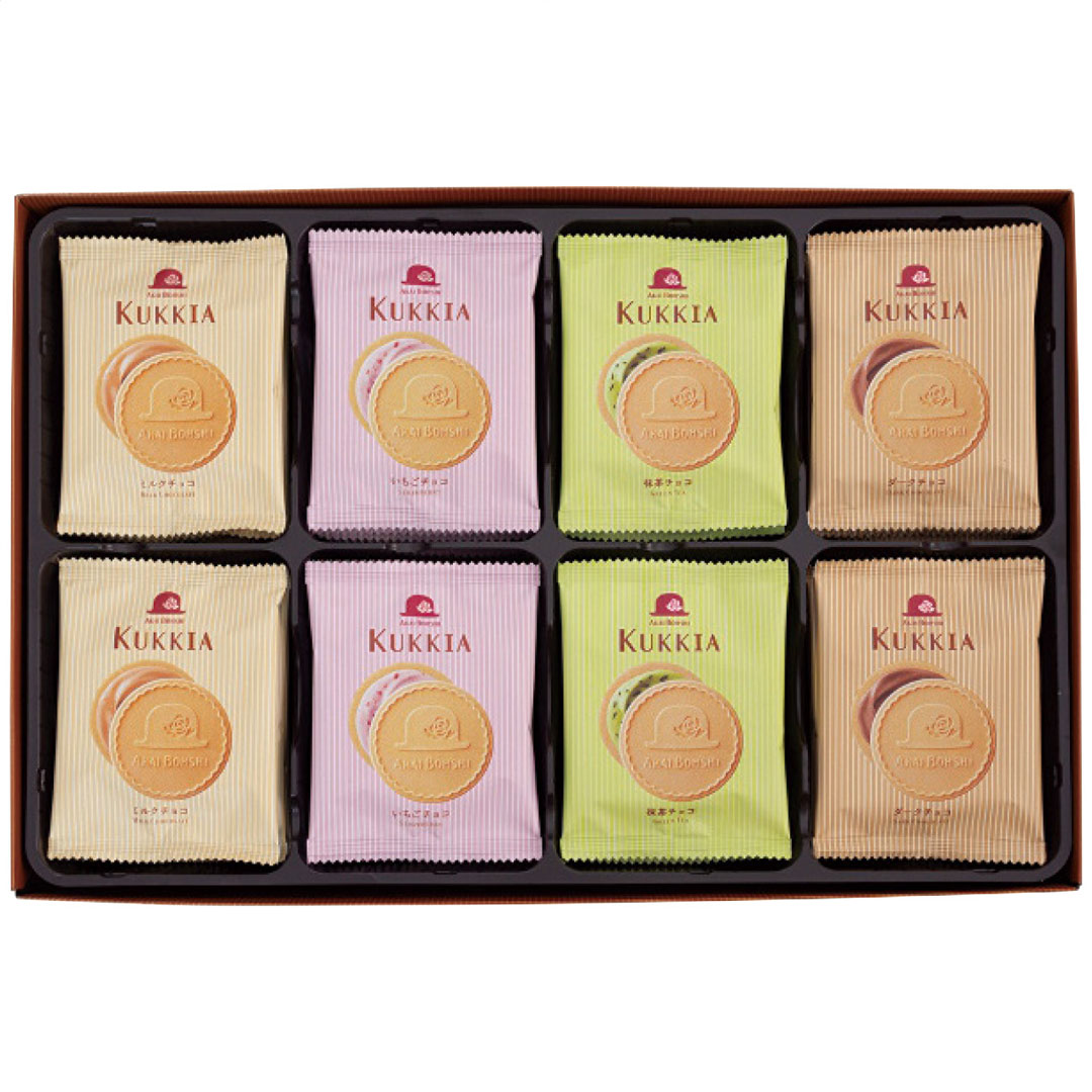現品サイズ・内容:クッキア(ミルク・ダーク・いちご・抹茶各8枚)
