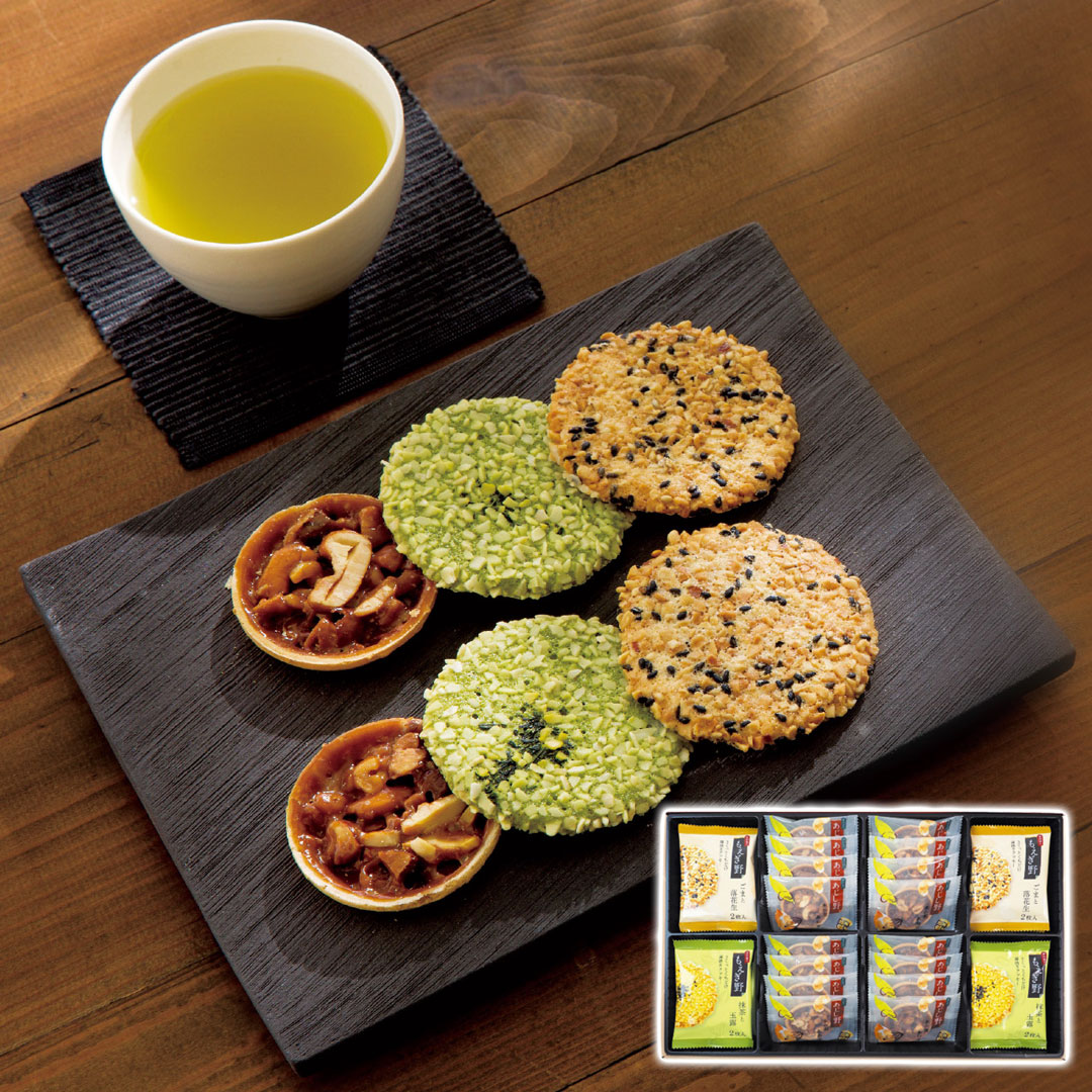 現品サイズ・内容:ごまと落花生・抹茶と玉露各(2枚入×8袋)・木の実あわせ16枚