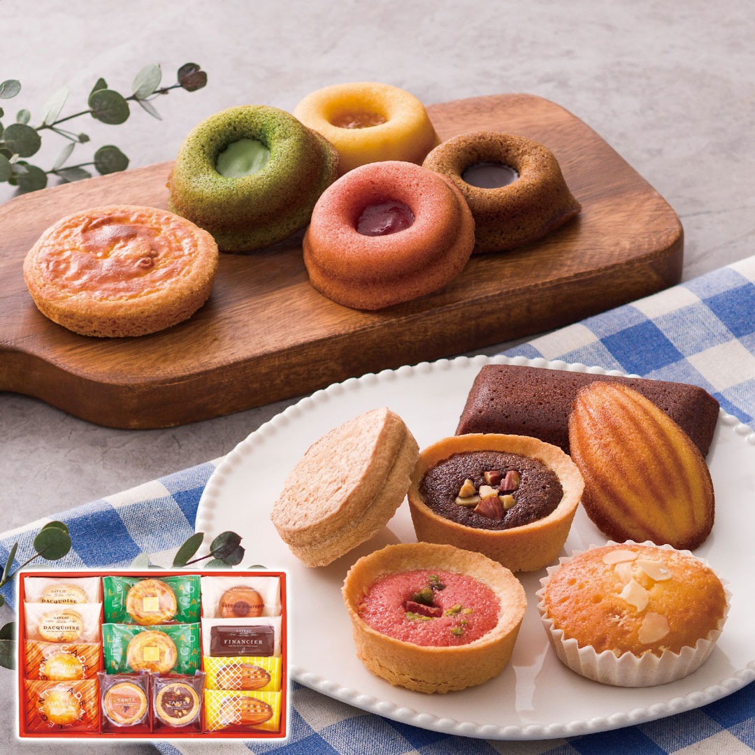 現品サイズ・内容:ダックワーズプラリネ・マジパンケーキ・ガレット・チーズカップケーキ各2個・フィナンシェショコラ・リングフィナンシェいちご・プチタルト(いちご・ショコラ)各1個
