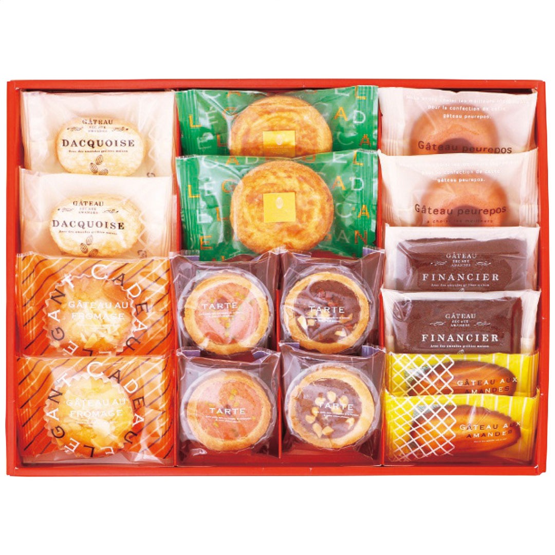 現品サイズ・内容:ダックワーズプラリネ・マジパンケーキ・ガレット・フィナンシェショコラ・プチタルト(いちご・ショコラ)・リングフィナンシェいちご・チーズカップケーキ各2個