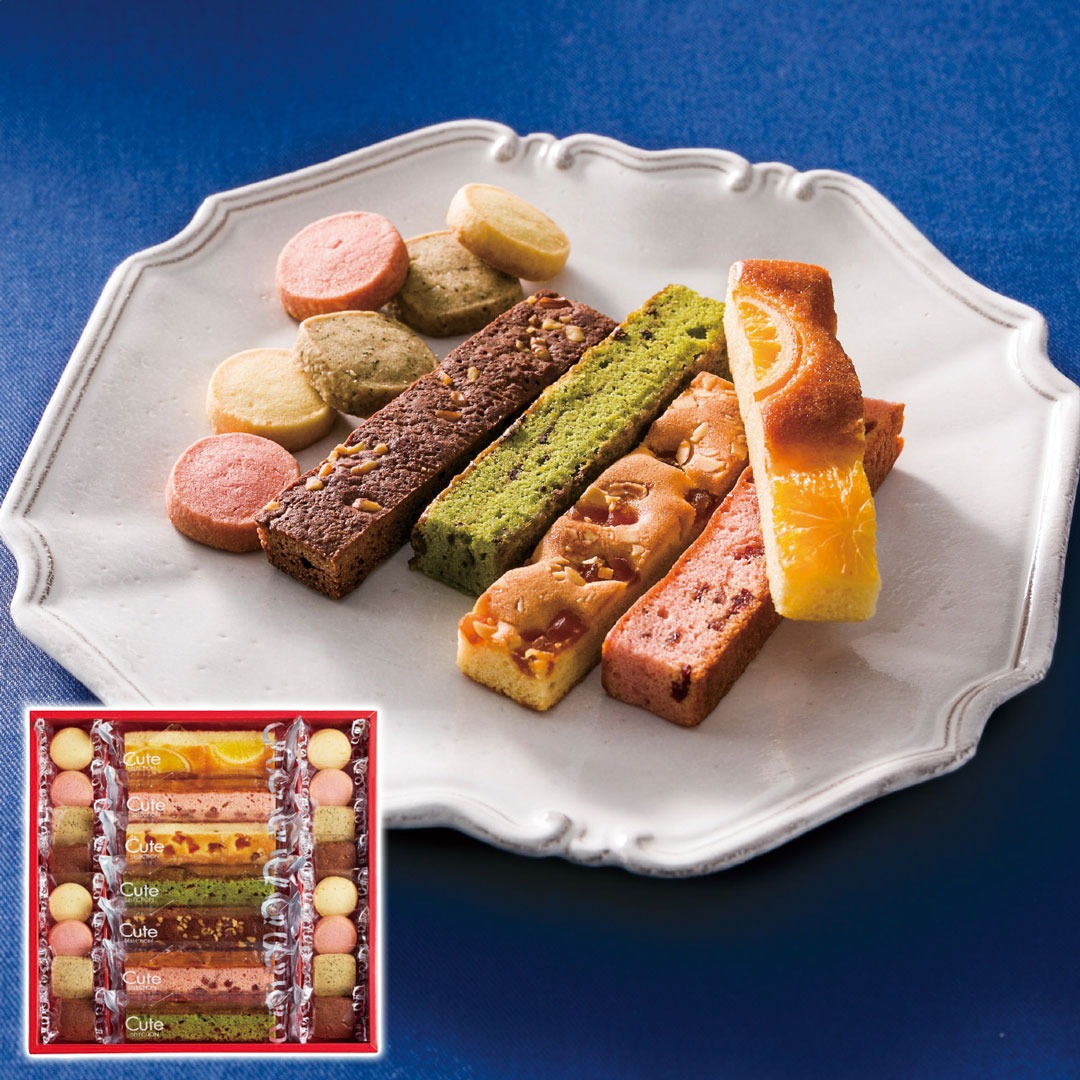 現品サイズ・内容:ケーキ(オレンジ・キャラメルアップル各1個・ミックスベリー・抹茶ショコラ各2個)・ニューヨークブラウニー1個・クッキー(ショコラ・ストロベリー・アールグレイ・レモン各4個)